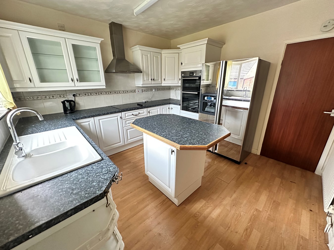This detached three bed house is situated in a quiet residential area and offers excellent potential for a purchaser to modernise and create a lovely home. The ground floor accommodation comprises an entrance hall with useful understairs cupboard, a cloakroom and a living/dining room. The kitchen is fitted with a range of units and worktop space, along with a small central island and integrated oven and hob. A rear porch provides access to the garden. Upstairs there are three bedrooms and a generous shower room. Although the property would benefit from modernisation, it offers an exciting opportunity for buyers to put their own stamp on a home and it is offered for sale with no onward chain. Outside, the front of the property enjoys a paved seating area bordered by shrubs and flowers. Side access leads to the enclosed rear garden which features a further paved seating area, lawn, shrub and flower borders and a summer house. The property also benefits from a garage and off-road parking.