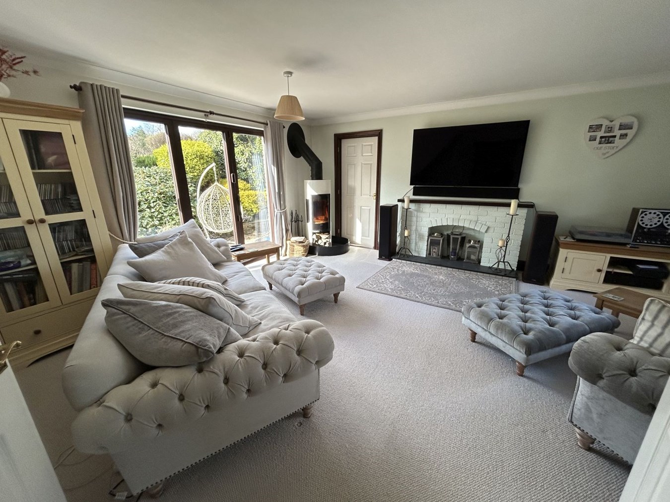 Tucked away on a peaceful cul-de-sac and backing onto open farmland, this delightful family home offers spacious, flexible living with stunning countryside views. Tastefully presented throughout, it’s perfect for modern family life. The welcoming entrance hall leads into a light and airy dining area, while French doors open to the generously sized living room, complete with a cosy wood-burning stove and bi-fold doors that flood the space with natural light and frame the delightful outlook. A useful store room off the living room provides access to the double garage. The kitchen/diner is well-equipped with a range of base and wall units, plumbing for a dishwasher, washing machine and Rangemaster cooker. A door opens to a charming seating area, ideal for al fresco dining whatever the weather. Upstairs are four well-proportioned bedrooms, a family shower room and a superb master suite featuring an en-suite bathroom and a fabulous veranda. The perfect spot to enjoy your morning coffee or evening glass of wine while soaking up the surrounding countryside views. Outside, the front of the property offers a driveway leading to the double garage, while gated side access takes you to the beautifully landscaped rear garden. With a good-sized lawn, established borders and a choice of patio seating areas, it’s perfect for entertaining or simply relaxing in the tranquil setting, with uninterrupted views across the farmland beyond.
