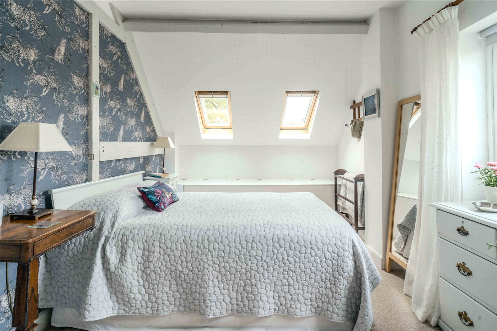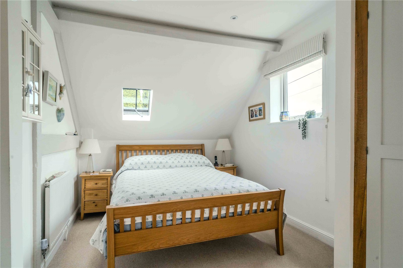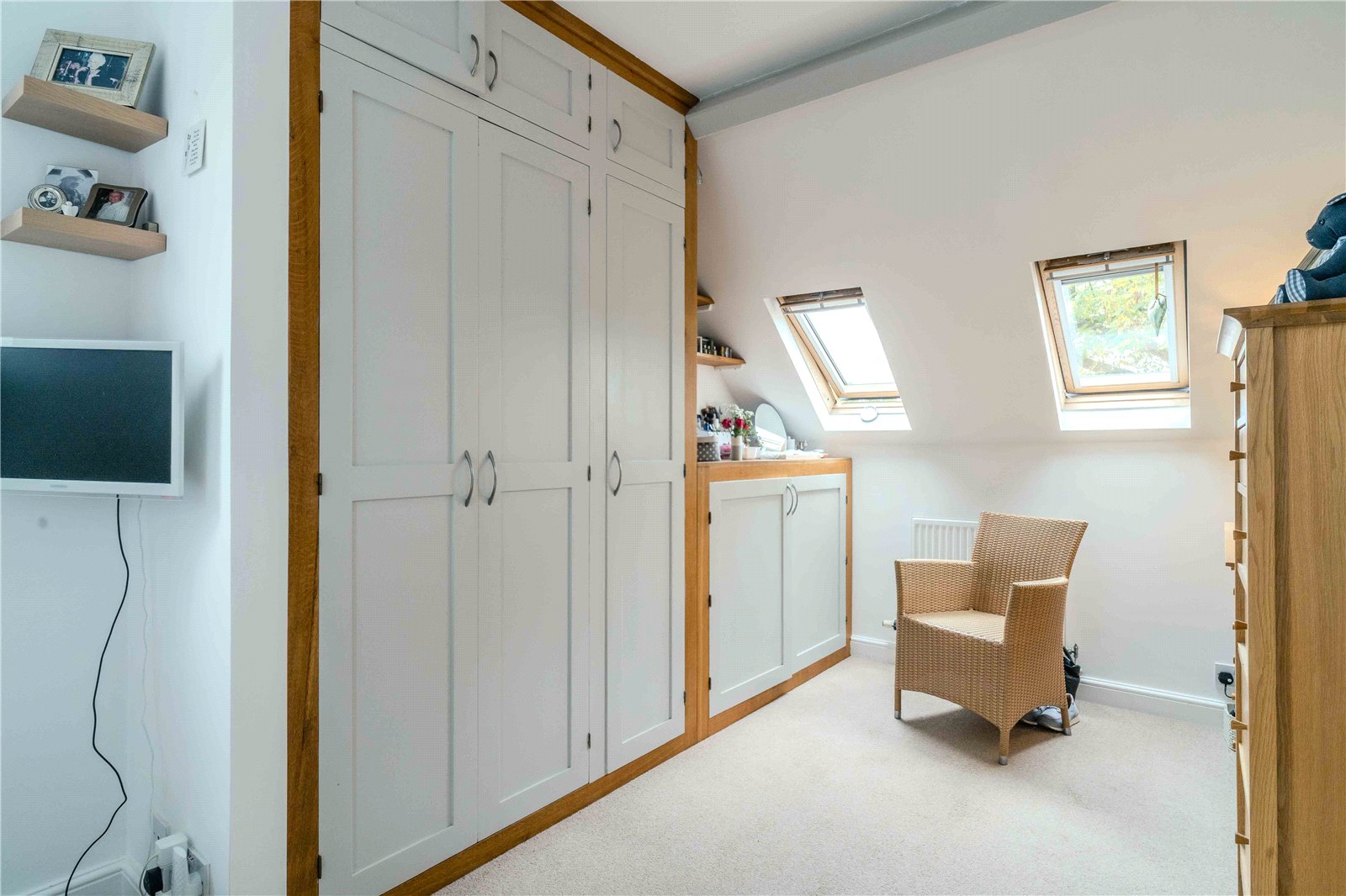 Upstairs the bright principal bedroom benefits from built-in wardrobes and is adjacent to a shower room featuring a large, fitted storage cupboard. There is a further double bedroom with under eaves storage and an en-suite shower room.