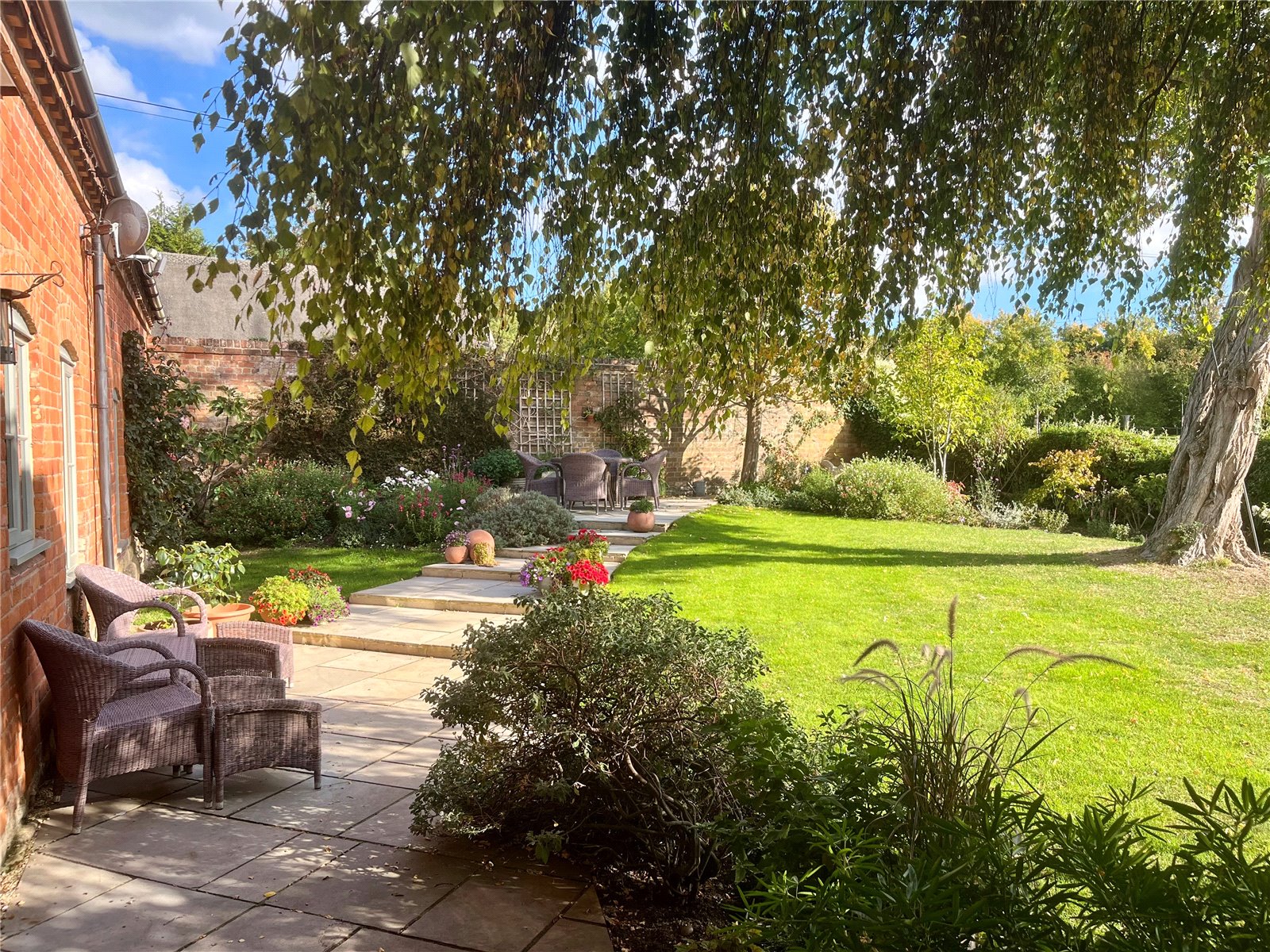 The south-facing rear garden is an absolute delight, boasting mature borders, established trees, neatly manicured lawn and stone paving leading to a larger terrace, perfect for enjoying summer evenings with friends. It provides a high degree of privacy, being enclosed by fencing, hedging and an original brick wall.
