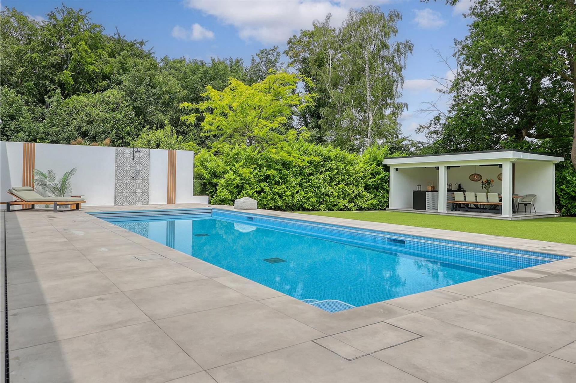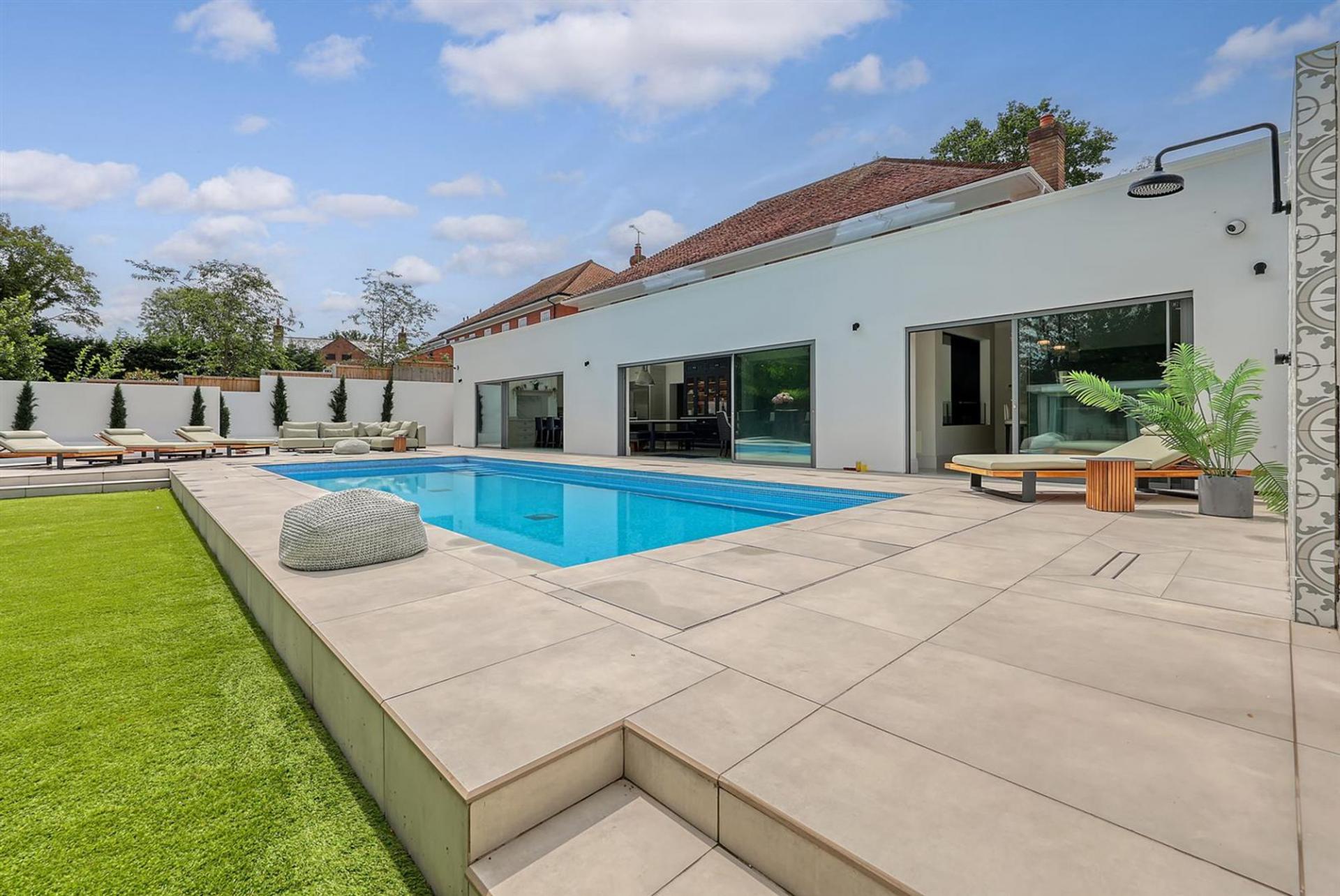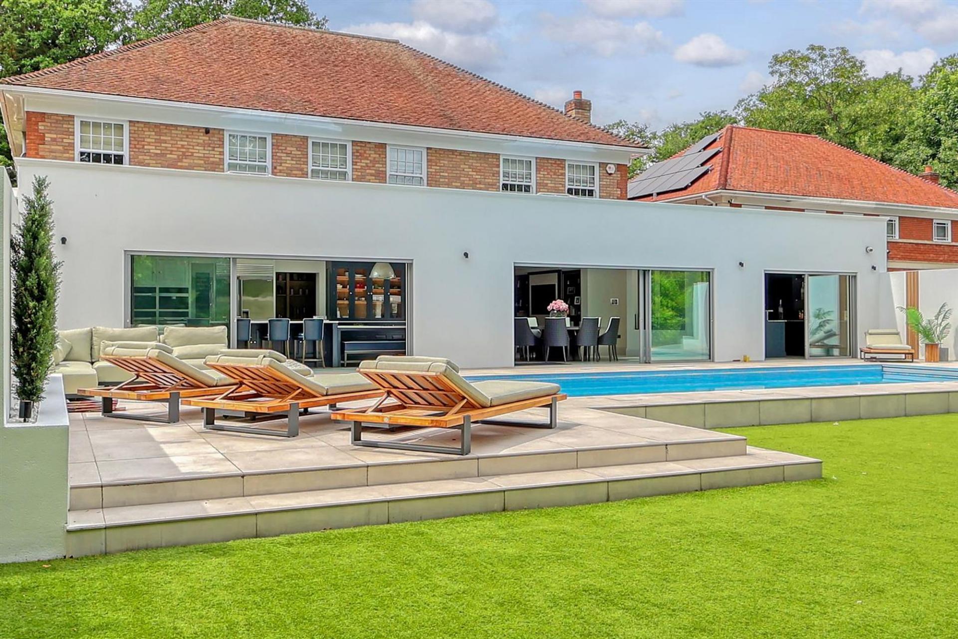 Externally the property is accessed via a secluded sweeping driveway offering ample parking to the front. With secure, gated side access to the rear garden which has been recently landscaped and now boasts a stunning heated swimming pool and sun terrace. You step down onto an artificial lawn which looks pristine all year round and leads to the outdoor kitchen entertaining area with fully equipped kitchen and covered seating area.