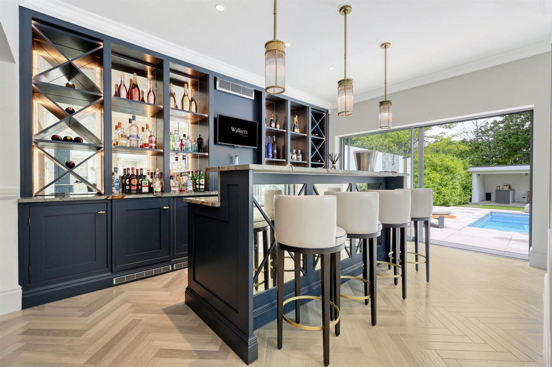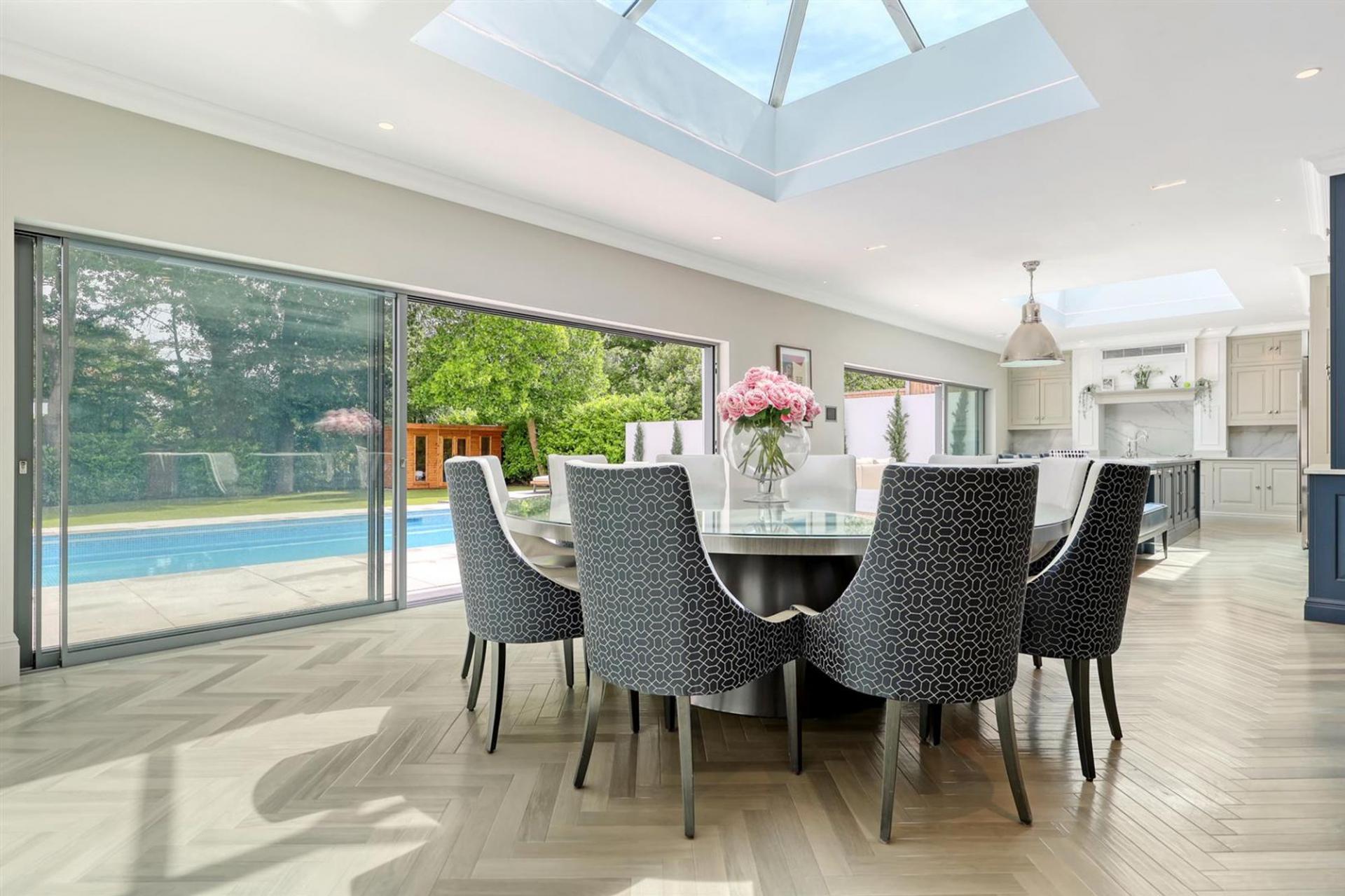Ground floor accommodation comprises four key reception spaces, in addition to a wonderful vaulted entrance hall with porcelain tiles, which impresses immediately. Double Crittal glass doors offer views from the hallway through to the rear garden. The heart of the home is the open plan kitchen / dining living space with a bespoke made kitchen, offering Quartz worktops and complete with a range of Miele integrated appliances and a breakfast seating area. A formal lounge area and separate dining space are warmed by the open fire which separates these spaces from the bar, with high stools and under counter integrated fridges. A further set of doors lead through to the games room and second wc with access to the remaining garage space. The internal fittings and joinery are all exemplary, and rooms such as the utility / boot room, with space for 2 x washing machines and 2 x tumble dryers and two cloakroom/wc's all add to the functionality of this family home. Ground floor accommodation is complete with a playroom / home office from the hallway and an impressive recently fitted cinema room with full soundproofing and audio / visual Halo AV system with projector. The ground floor boasts underfloor heating, air conditioning, Karndean flooring and a Rako lighting system.