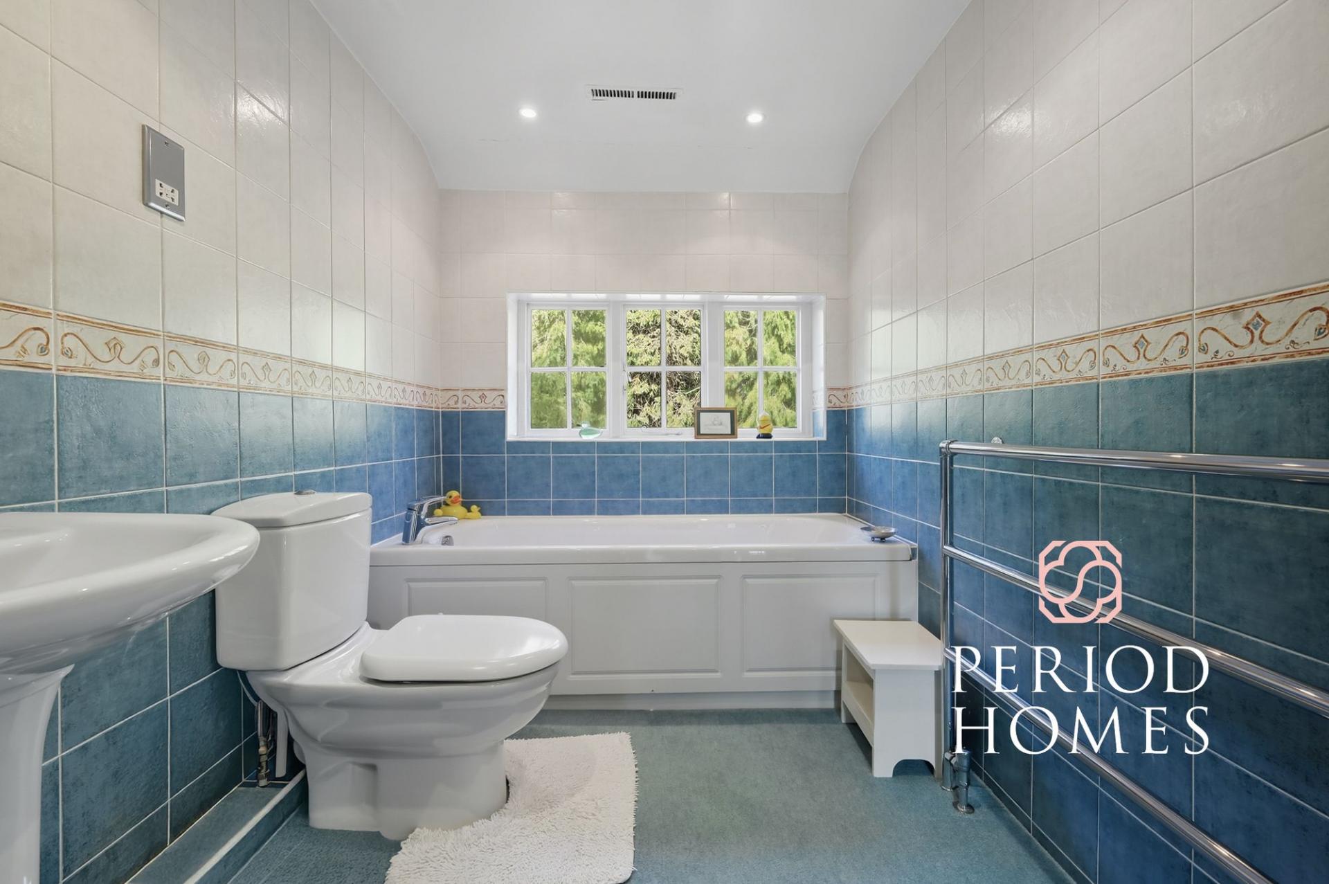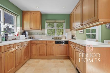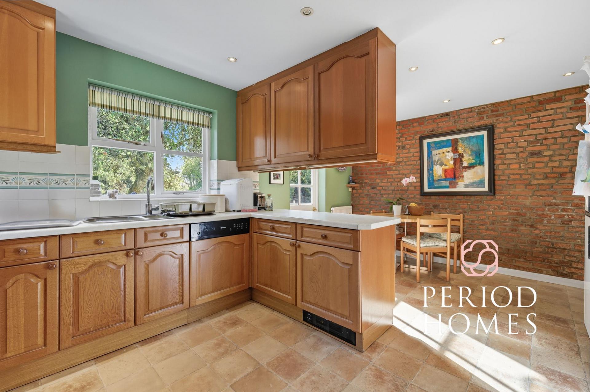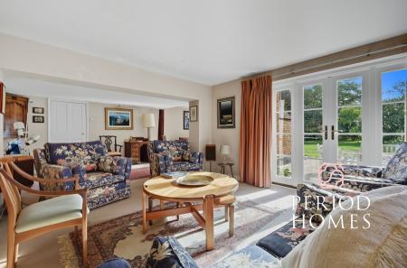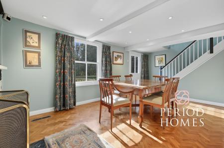 An entrance hall with parquet flooring leads to a selection of spacious reception rooms. The living room is bright and inviting, with French doors opening to the patio and gardens beyond - perfect for enjoying the idyllic setting. The dining room features an open fireplace, creating a wonderful ambiance for entertaining and family gatherings. A separate office, kitchen, and utility room provide excellent practical space.