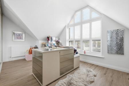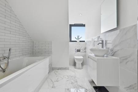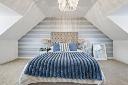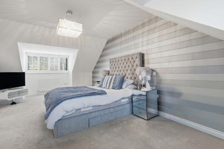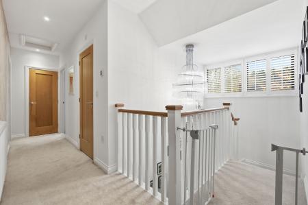 To the first floor, the generous accommodation continues with four bedrooms. The principal bedroom boasts a striking feature window overlooking the garden and open countryside beyond, along with a beautifully appointed en-suite shower room finished with elegant marble tiling. Bedroom two also benefits from its own modern en-suite shower room, while the remaining bedrooms are served by a luxurious family bathroom finished to the same impeccable standard.
