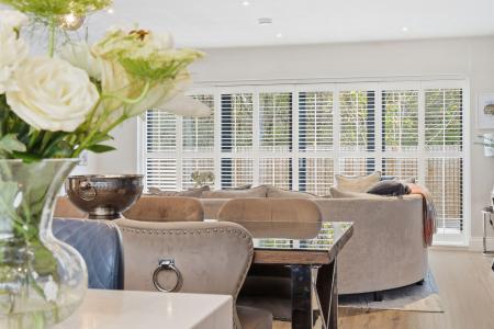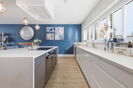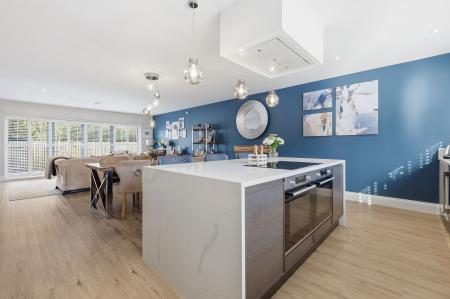 The heart of the home is the stunning open-plan kitchen, dining and family room, designed for both everyday living and entertaining. This impressive space is enhanced by bi-fold doors opening onto the garden. The bespoke high-gloss kitchen features extensive cabinetry and a striking central quartz island with inset induction hob and integrated extractor, along with Bosch appliances including double oven, fridge/freezer, dishwasher and wine cooler. A separate utility room provides further storage and space for laundry appliances, ensuring practicality without compromising on style.