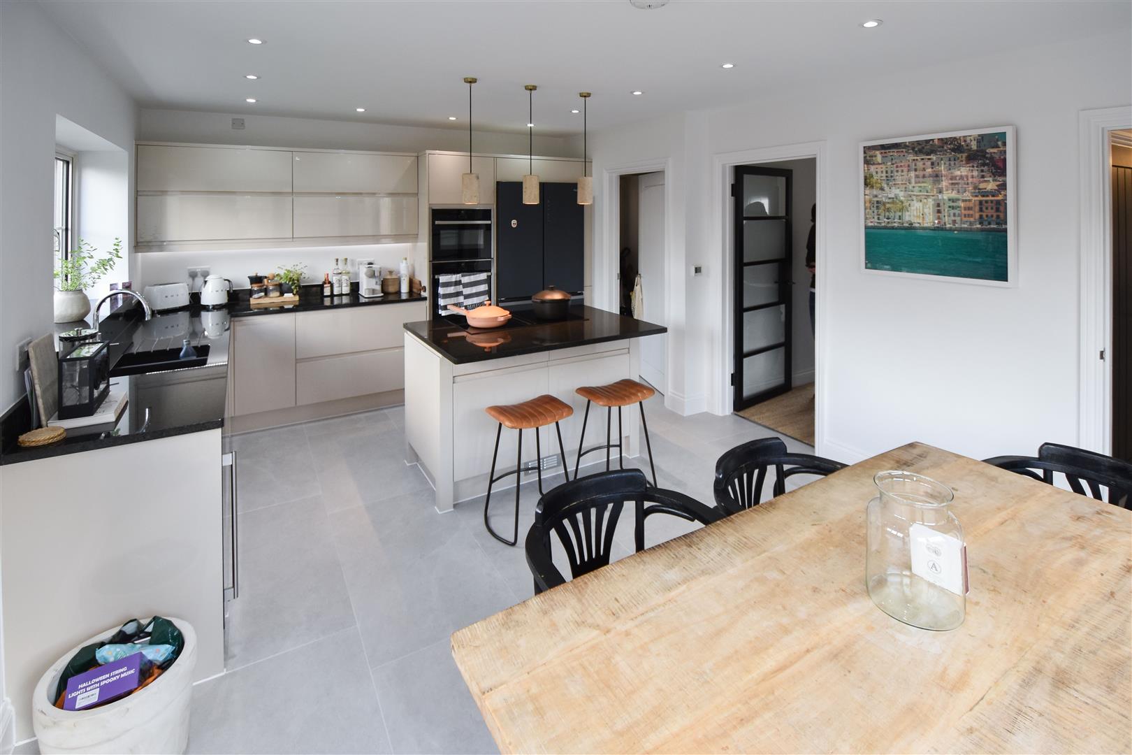 Entering the property, you find yourself in a bright hallway with doors into both reception rooms, a luxury kitchen/diner and into a modern ground floor cloakroom, and there are stairs which rise to the first-floor level. The property has two spacious reception rooms, a bright lounge with triple aspect windows flooding the room with lots of natural lighting, and there is a comfortable sitting room, also of good measurements which has access into the kitchen/diner. High gloss wall and base units with quartz work surface adorn the kitchen area, providing ample storage options and there are integrated appliances to include double oven and built-in wine chiller. Furthermore, there is a central island unit with storage and inset hob with built-in extractor. There is also space for a large, double fronted fridge/freezer and additional appliances. Bi-folding doors open directly onto the patio area in the garden, making this a great entertaining space in the warmer months. Off the kitchen there is a separate utility room with counter tops and further access into the garden at the side.