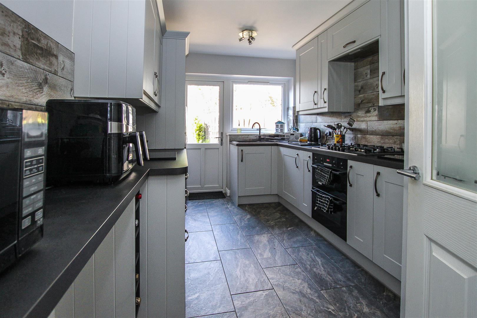 Kitchen - 5.08m x 2.49m (16'8 x 8'2) - Dark tiled flooring. Modern light grey wall and base units with contrasting work surface over. Integrated double oven and gas hob with extractor above. Door into garden and window to rear.