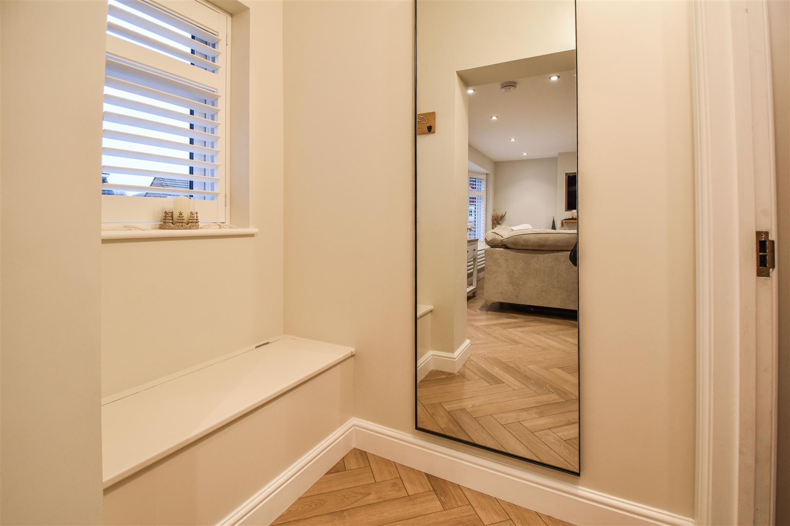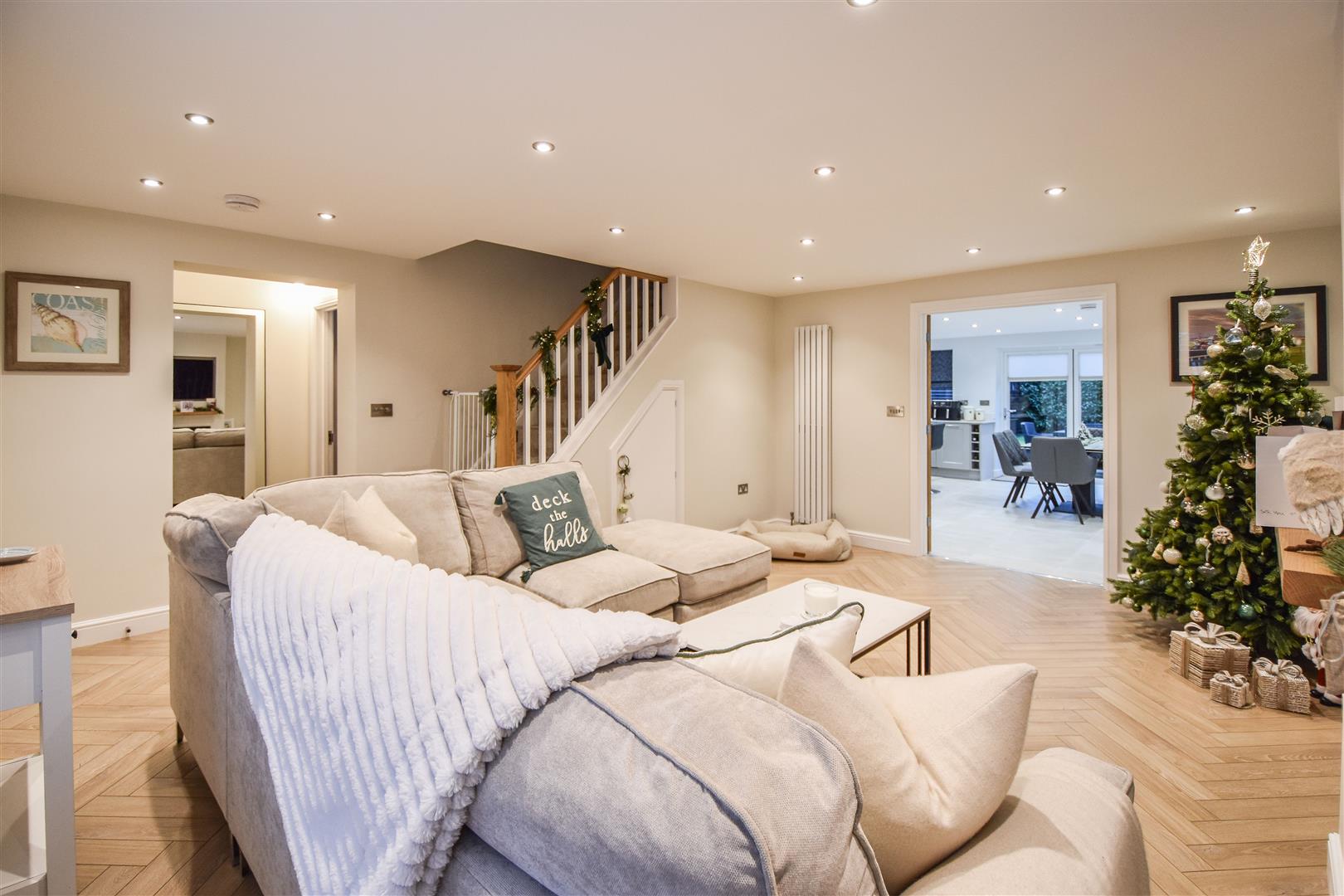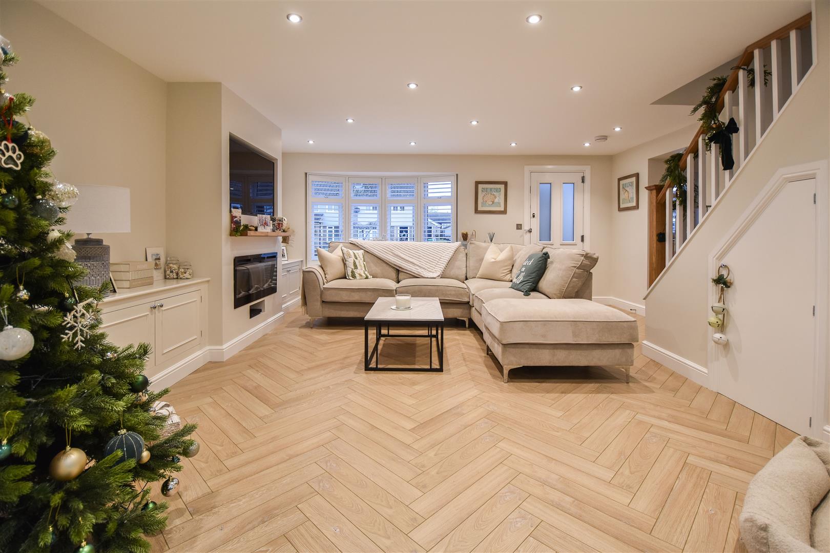 The porch opens into a welcoming family lounge, beautifully presented and bathed in natural light from the bay window to the front. Stylish built-in wall units with a sleek, integrated television create a refined yet comfortable space, perfect for relaxing together at the end of the day.