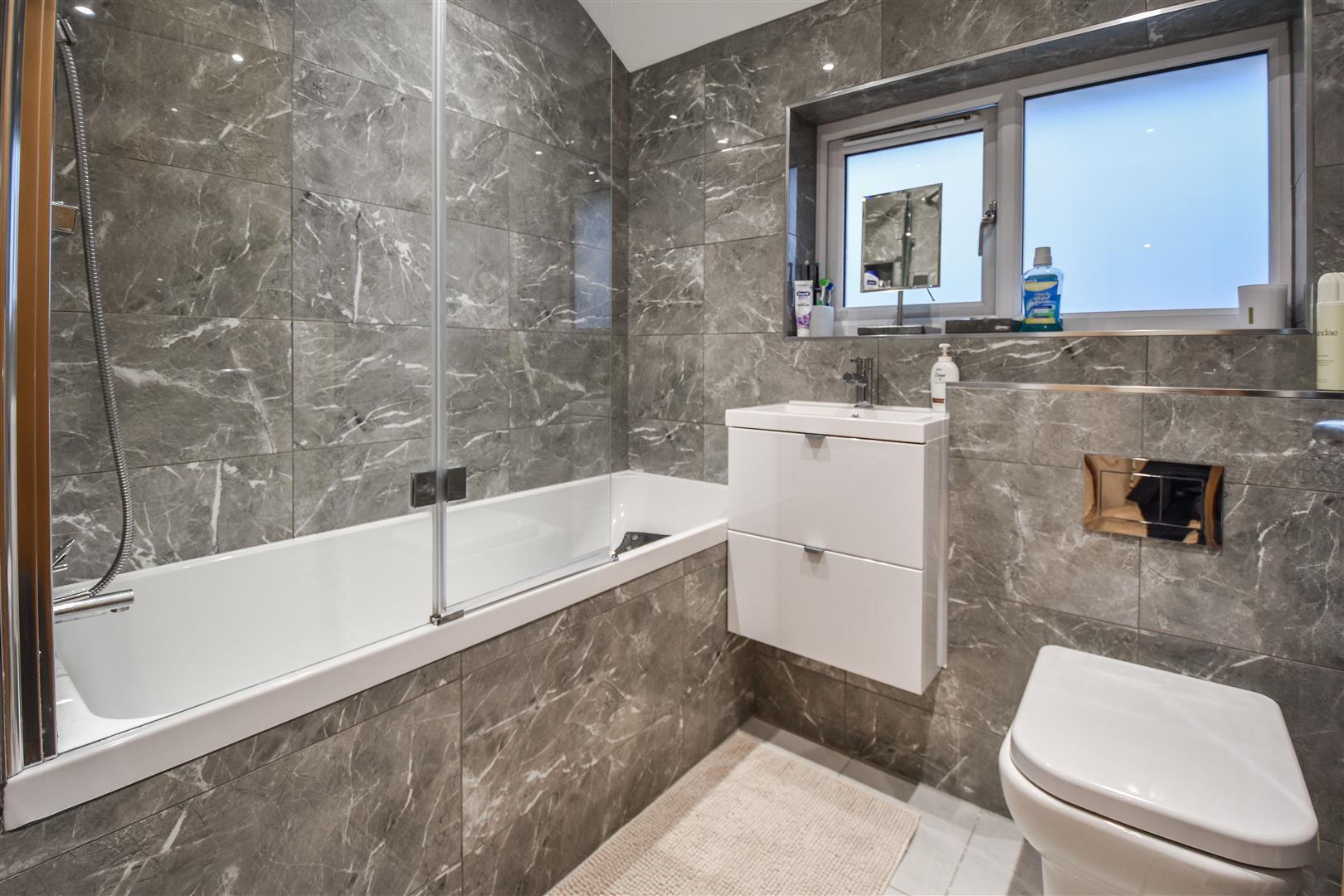 Bathroom - Fitted with a three piece white suite consisting bath with shower over and glass panel, sink and wc. Fully tiled.