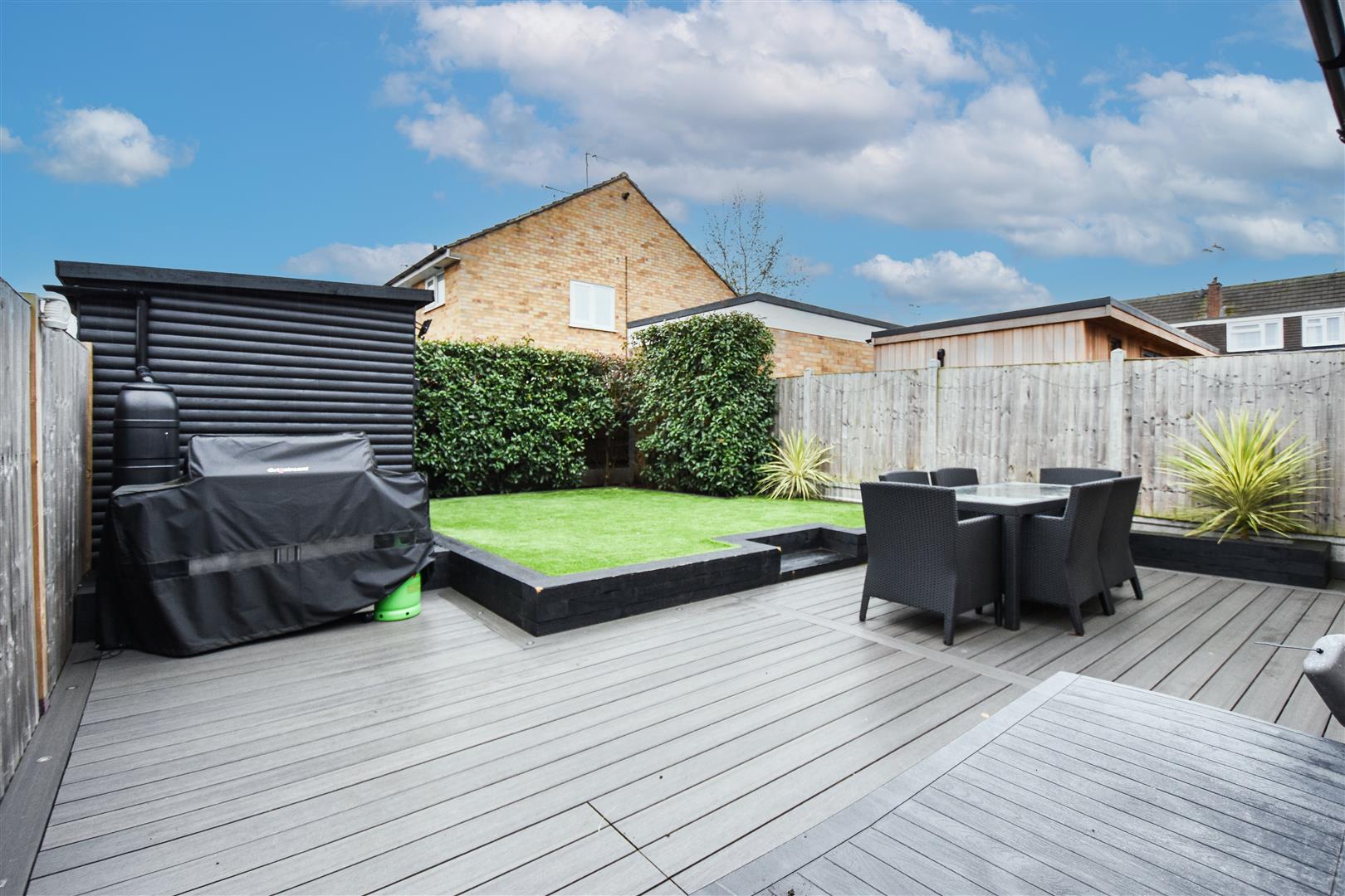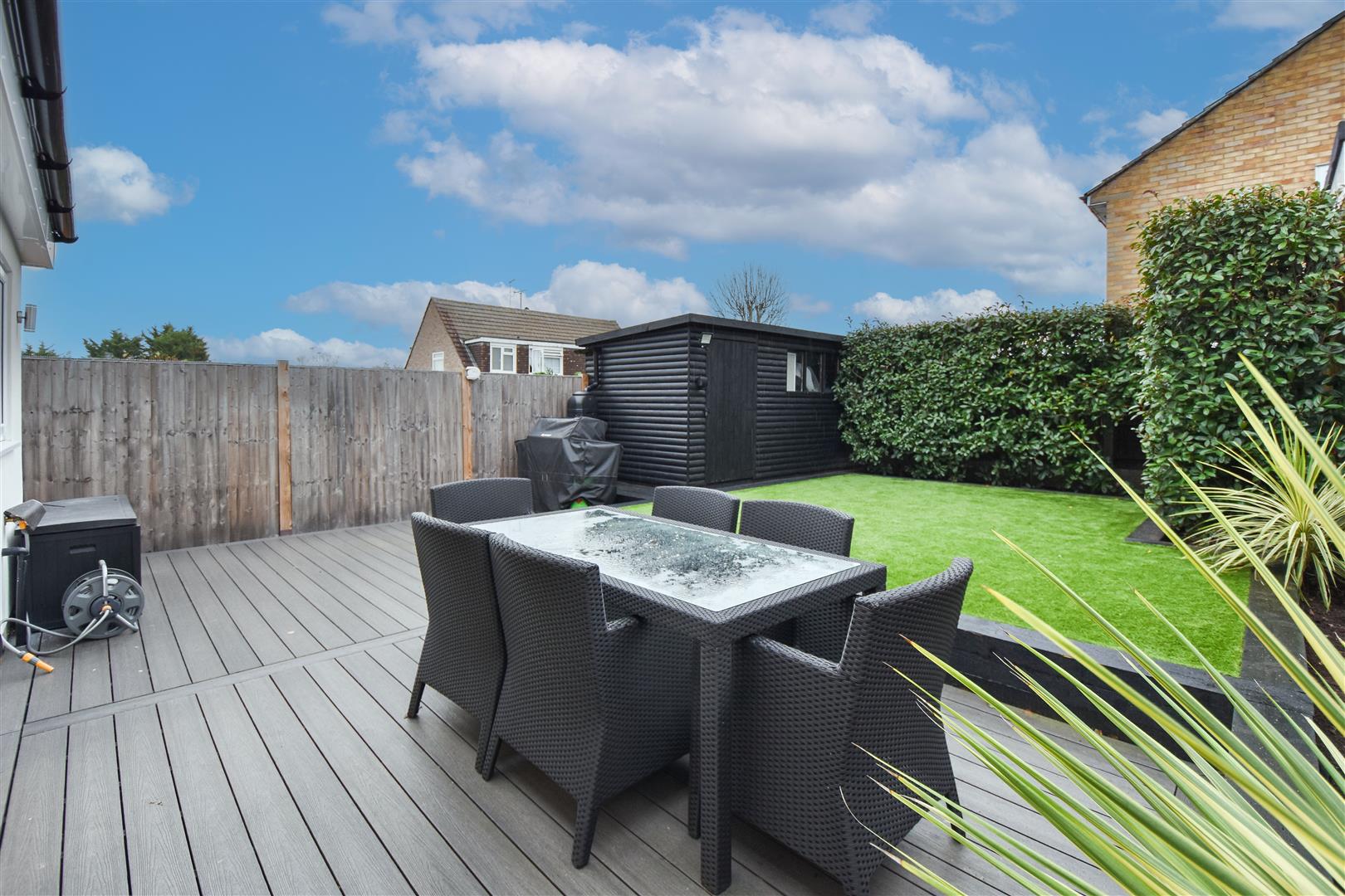 Rear Garden - Commencing with a large composite patio with ample seating space overlooking a neat garden with low retaining brick walls. Shed to remain.