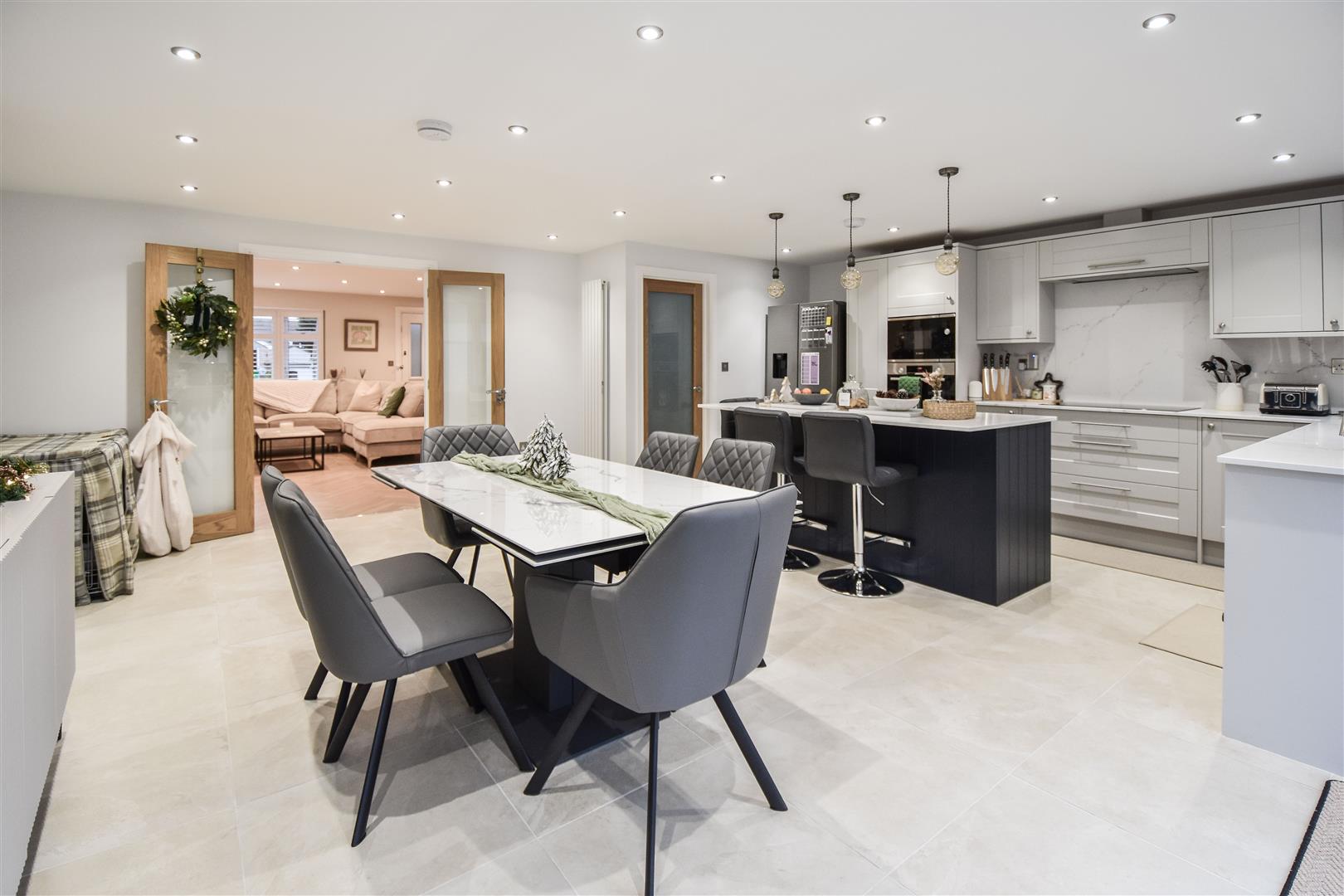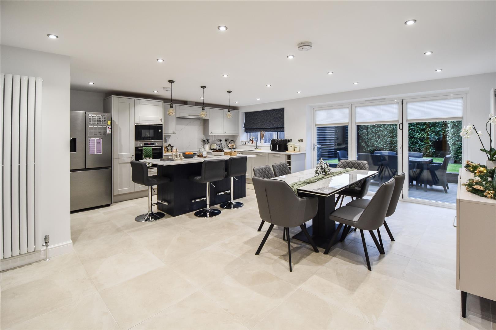 This impressive space features a beautifully tiled floor and expansive bi-folding doors that open out onto the rear garden, seamlessly blending indoor and outdoor living. The contemporary kitchen is fitted with elegant grey units, complemented by luxurious white marble work surfaces. The striking French navy island provides both additional storage and a sociable seating area, ideal for casual dining, homework, or entertaining. There is also ample room for a large family dining table and sideboard, making this the perfect setting for family meals and gatherings with friends.