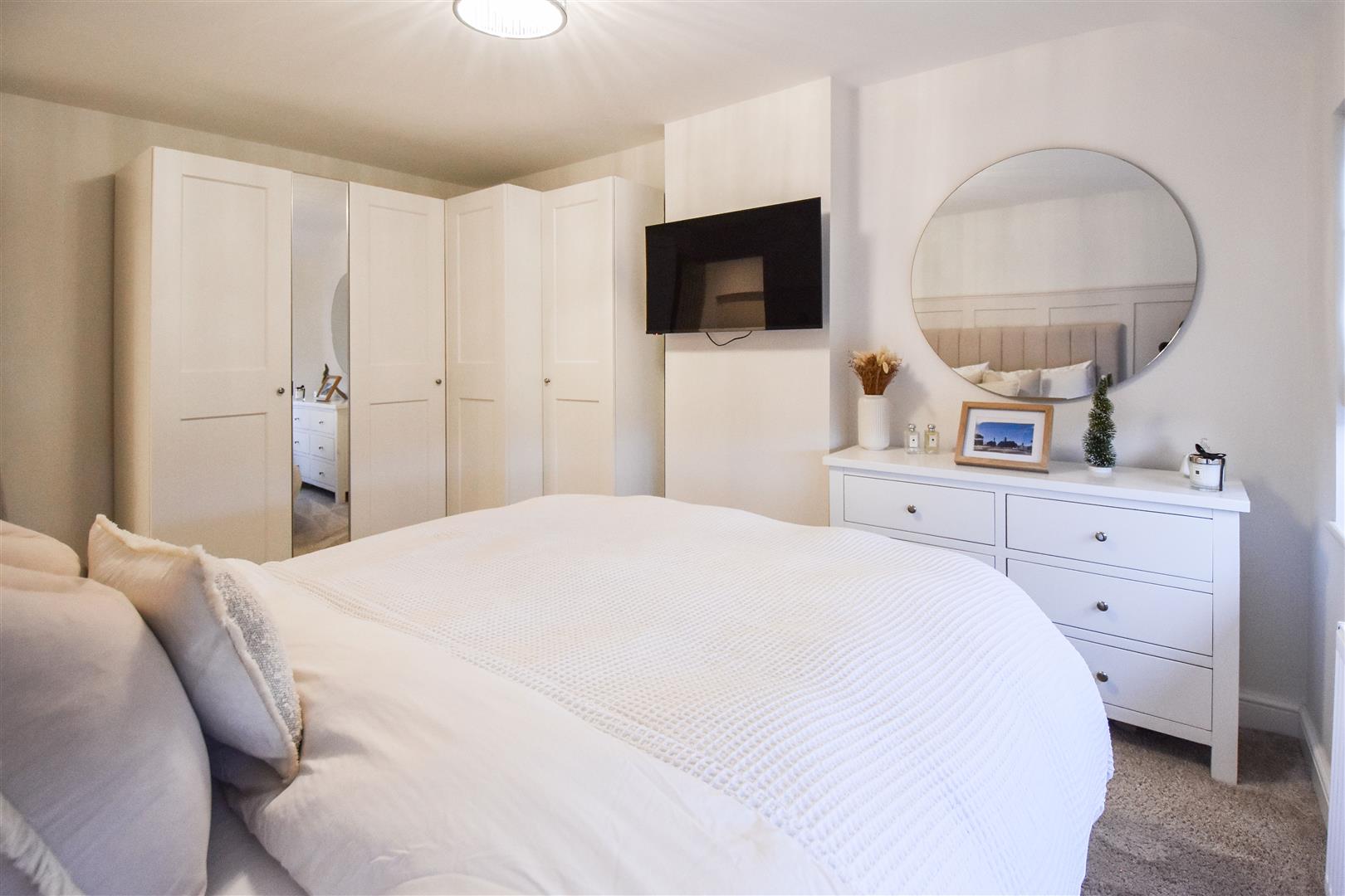 To the first floor are three thoughtfully designed bedrooms, each finished in soft, calming tones to create a tranquil retreat. The master bedroom enjoys a front-facing aspect. The second bedroom overlooks the rear garden, while the third bedroom, ideal as a child's room, nursery, or home office, features a fitted cupboard and front-facing window. Completing the accommodation is the beautifully appointed family bathroom, fully tiled in rich, dark tones that perfectly complement the elegant white three-piece suite.