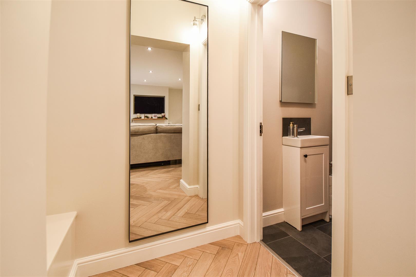 A square archway leads from the lounge into a central lobby, providing access to the convenient ground floor cloakroom, fitted with a white low-flush WC and hand basin. Returning to the lounge, glazed double doors open into the stunning kitchen/family room - truly the heart of this exceptional home and designed with modern family living in mind.