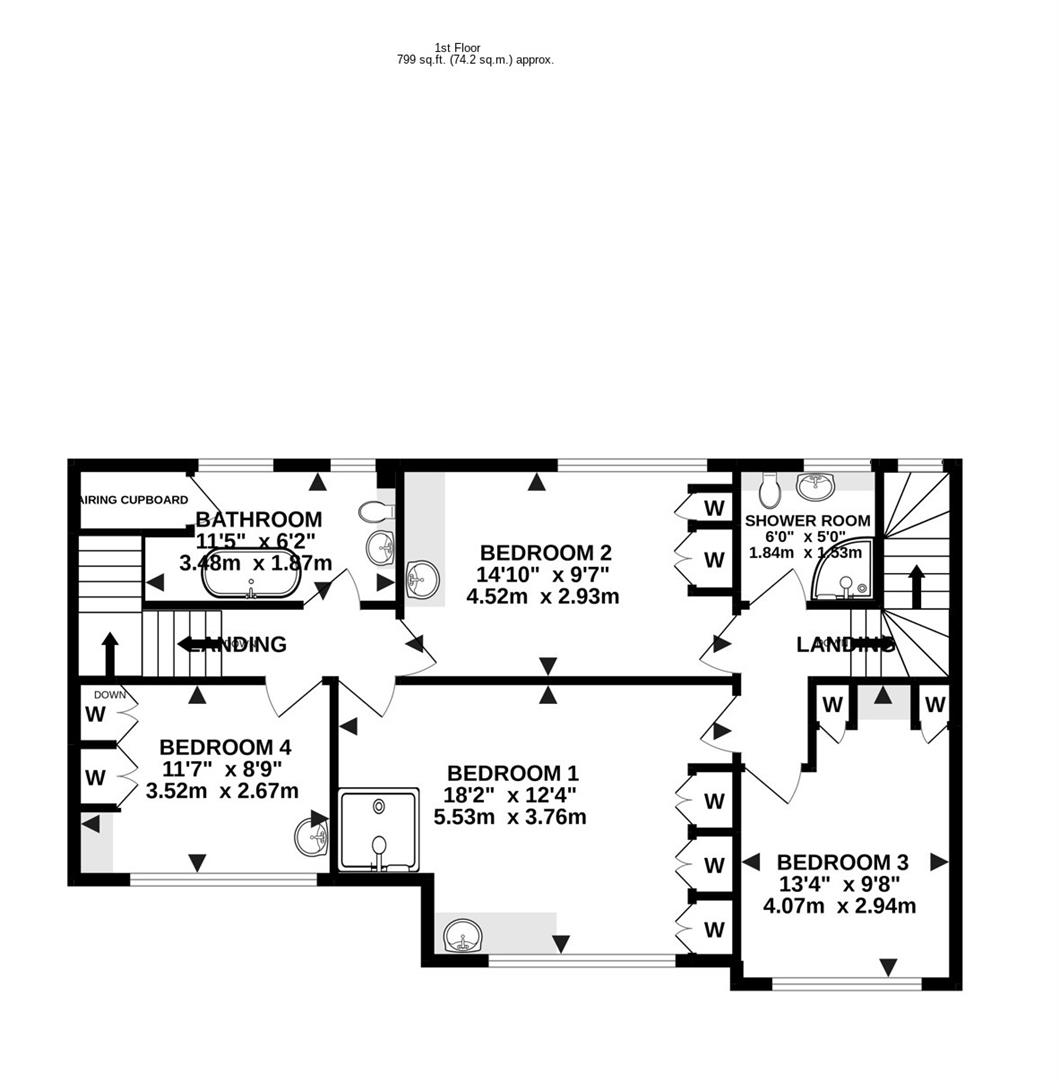 Master Bedroom - 5.54m x 3.76m (18'2 x 12'4) - Good range of fitted wardrobes. Within the room there is also a large power shower and single sink. Two separate doors giving access onto both landing areas.