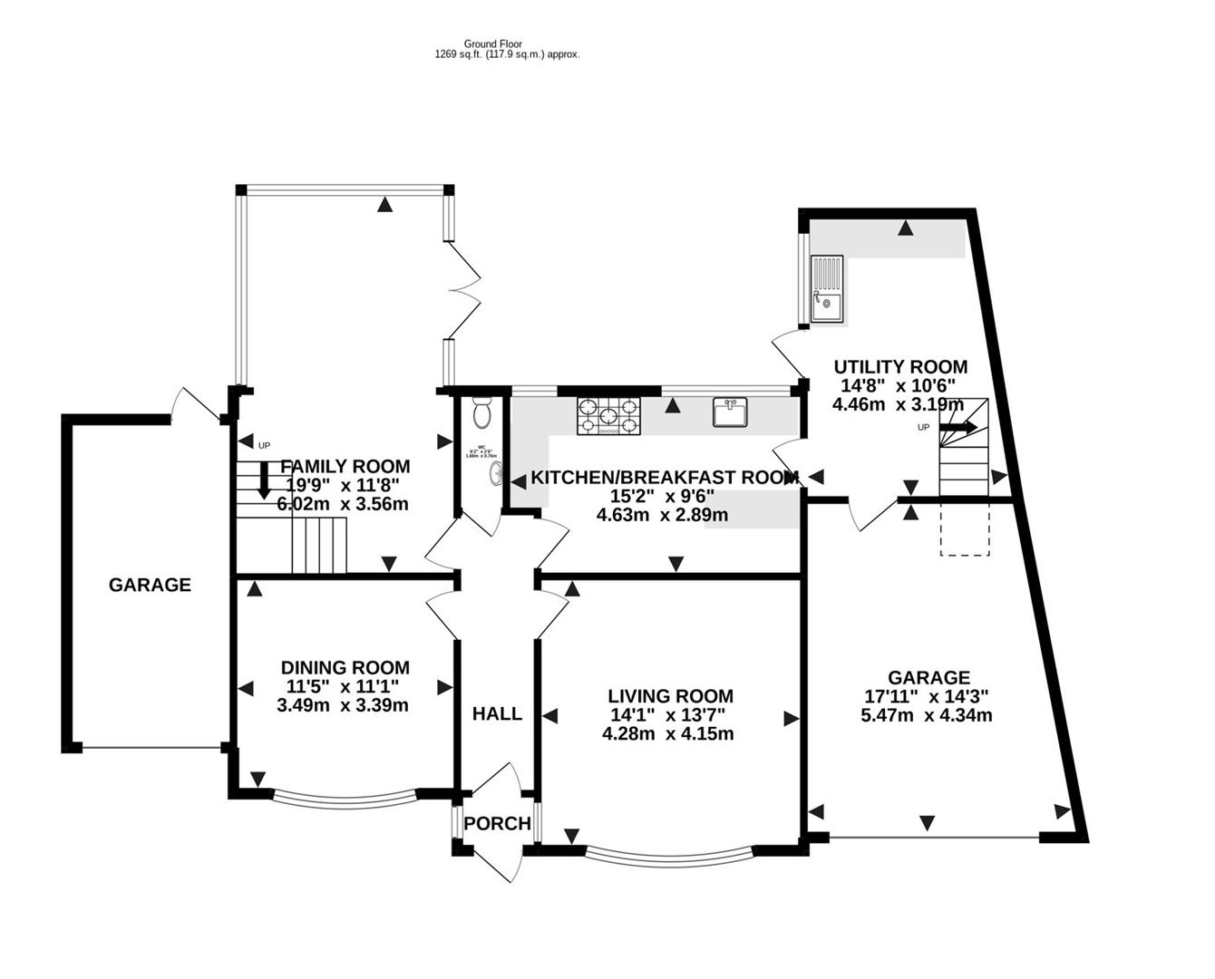 Entering the property via a porch leading into the hallway there are doors leading off to all main reception rooms, and the ground floor cloakroom. There is a large living room and a separate dining room both with bow bay windows overlooking the front of the property. A family room which is open plan to a conservatory with windows to all aspects, vaulted ceiling and French doors opening onto the rear garden. Stairs in the family room rise to the first floor. There is a spacious kitchen, fitted in a good range of modern 'Shaker' style wall and base units with integrated appliances and Butler sink. A door from the kitchen leads to a large utility room with wall and base units, sink unit, and space/plumbing for washing machine and tumble dryer. There is also a further door to the garden and a further set of stairs leading to the first floor.