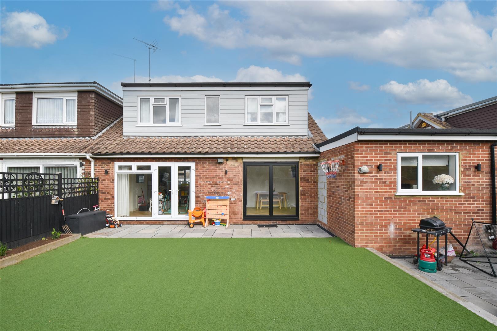 Exterior - Rear Garden - Commencing with a paved patio leading into an artificial lawn. There is a further patio/seating area to the rear of the kitchen. Sleeper edged flower beds.