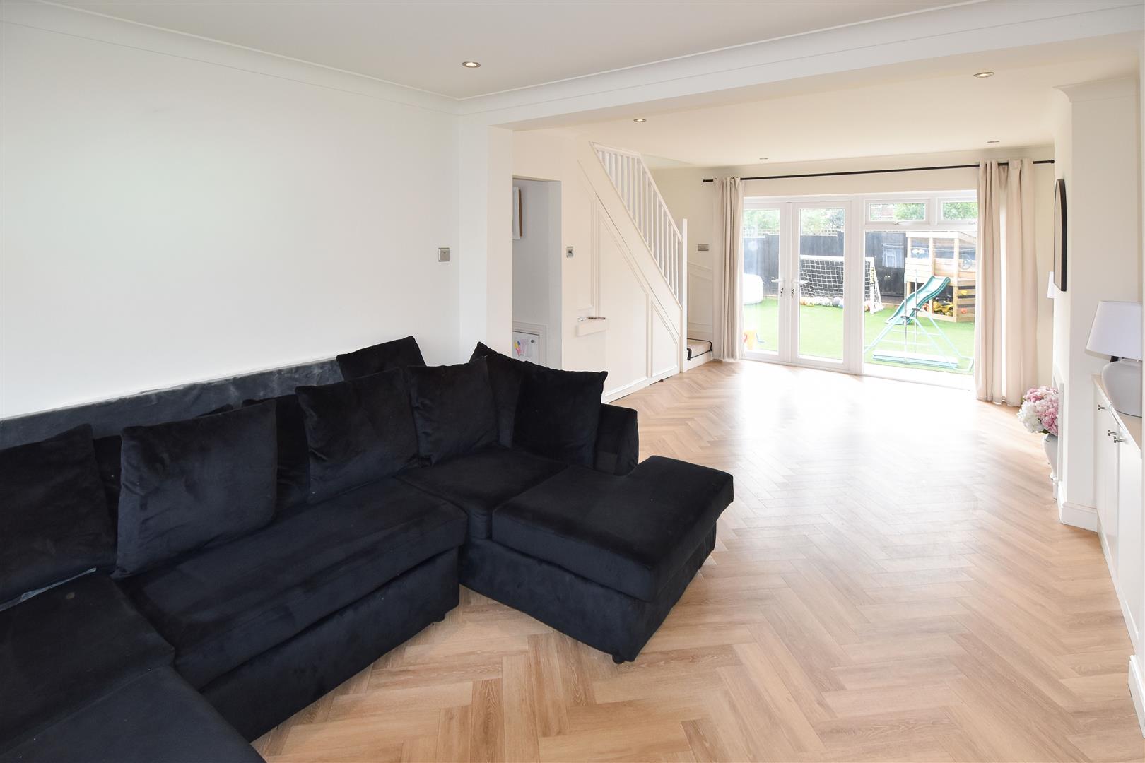There are steps up to the front door which give access into a bright porch, where you have a further door giving direct access into the playroom. The playroom opens into the living room and through to the kitchen, and there is a door which gives access into a spacious shower room/utility where there are wall and base units, plumbing for appliances, w.c. and wash hand basin, and a separate shower cubicle. The living room is lovely bright room with a window to the front aspect and French doors and further windows to the rear, allowing for plenty of natural lighting. There are stairs to one end which give access to the first-floor level. A further reception serves as a dining room which is open plan to a stylish kitchen. Bi-folding doors from the dining room give additional access to the garden. Having been previously extended to the side and rear, the current Vendors have transformed this space into a luxury kitchen with modern wall and base units and range of quality, integrated appliances. Amtico, 'Heringbone' style flooring extends through most of the ground floor, and there is an attractive, hexagonal tiled floor in the shower room/utility. There is underfloor heating to both the ground and first floor levels.