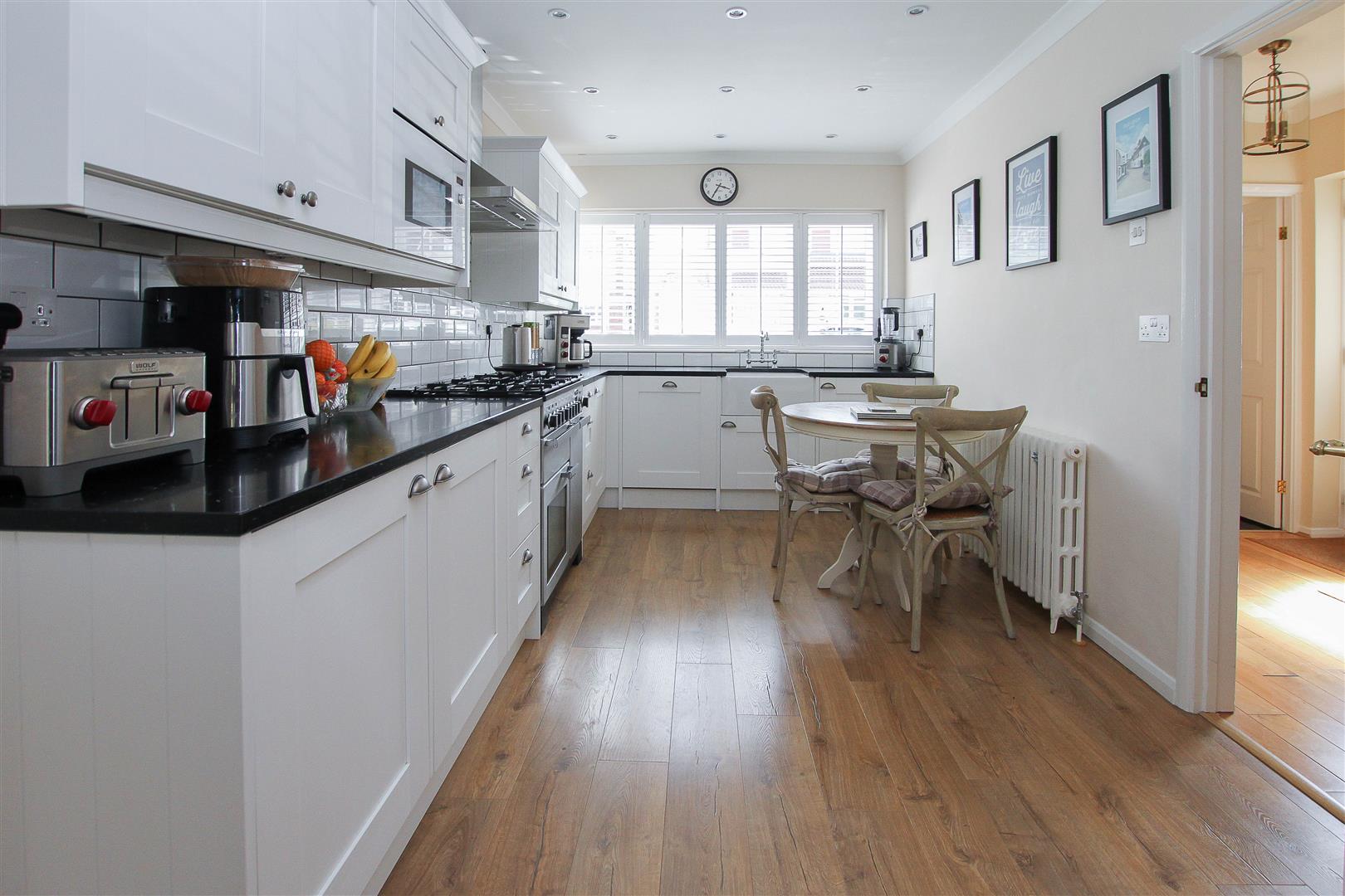 Kitchen / Diner - 4.65m x 2.74m (15'3 x 9') - Shaker style wall and base units with quartz work surface over. Space for Range style cooker with extractor above. Space also for a four settings, table and chairs. Double doors through to :