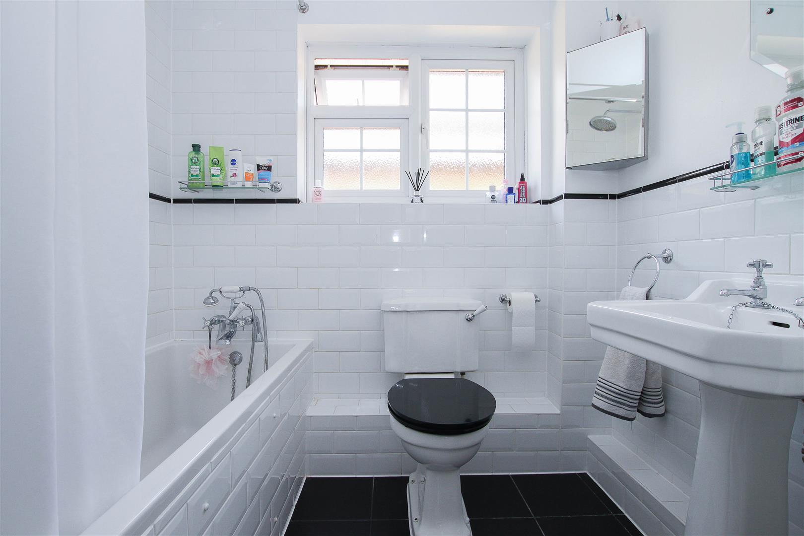 Family Bathroom - 2.16m x 1.65m (7'1 x 5'5) - Tiled flooring, part tiled walls. Tile panelled bath with mixer taps and telephone style shower attachment, pedestal wash hand basin and close coupled w.c.