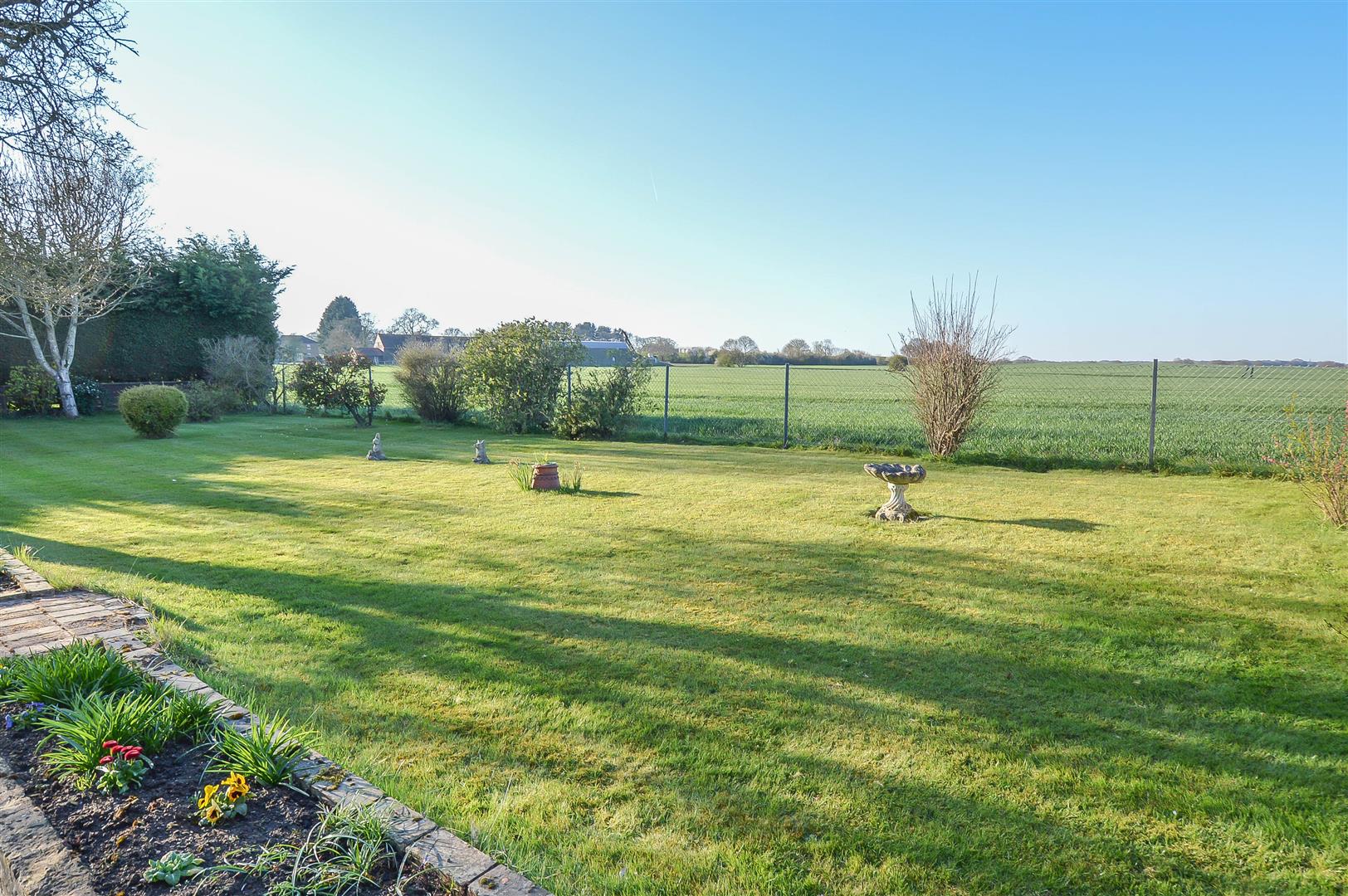Externally, the property boasts a beautifully maintained garden with a lush lawn, bordered by mature shrubs, and breathtaking views across open fields. To the front, two detached garages and off-street parking provide excellent convenience.