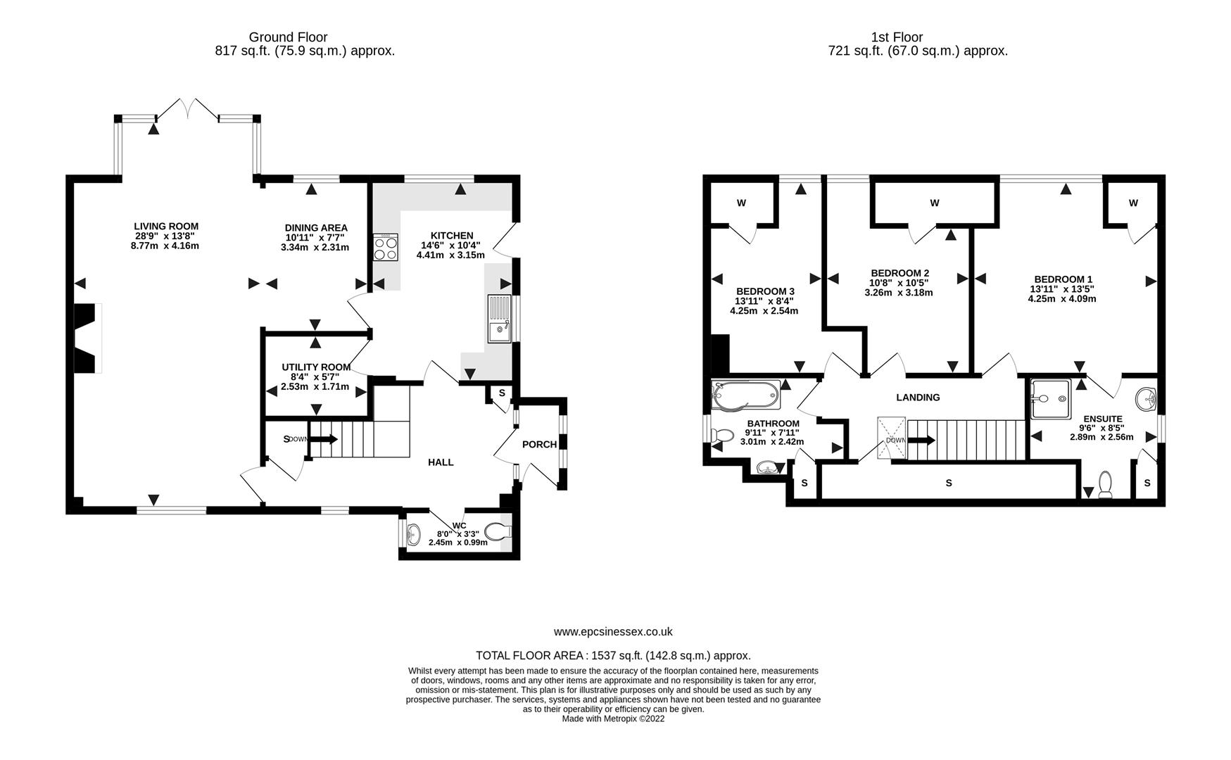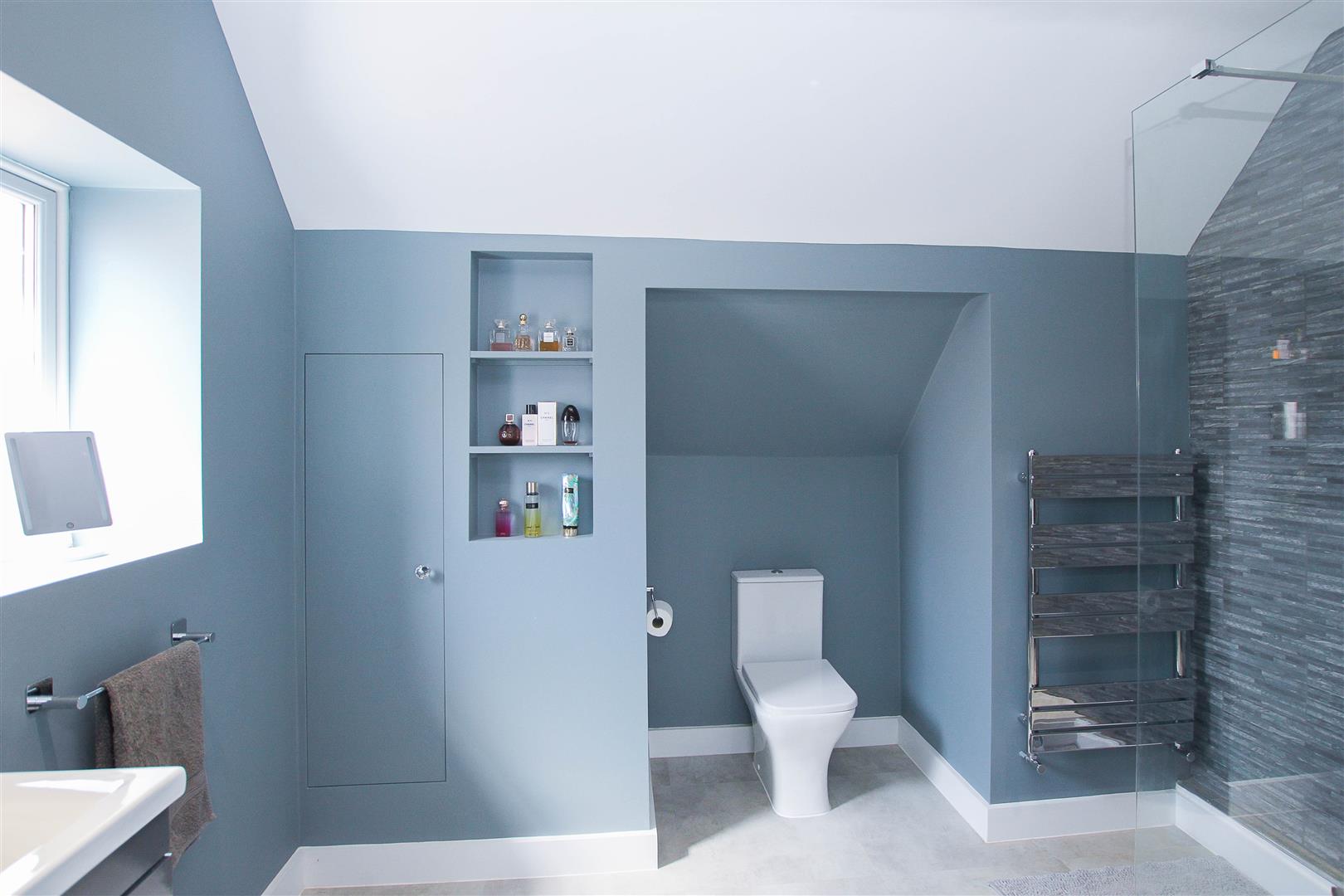 A spacious first floor landing gives access to all rooms on this level and has a large storage cupboard. All bedrooms have built in cupboards/storage of good size. Bedroom one has the benefit of a beautifully tiled en-suite shower room with double shower with rainfall overhead shower and additional handheld attachment. There is also a spacious family bathroom with large bath which has overhead rainfall shower and additional handheld attachment, wash hand basin set into a modern vanity unit and w.c. with hidden cistern. Both the en-suite and family bathroom have eaves storage.