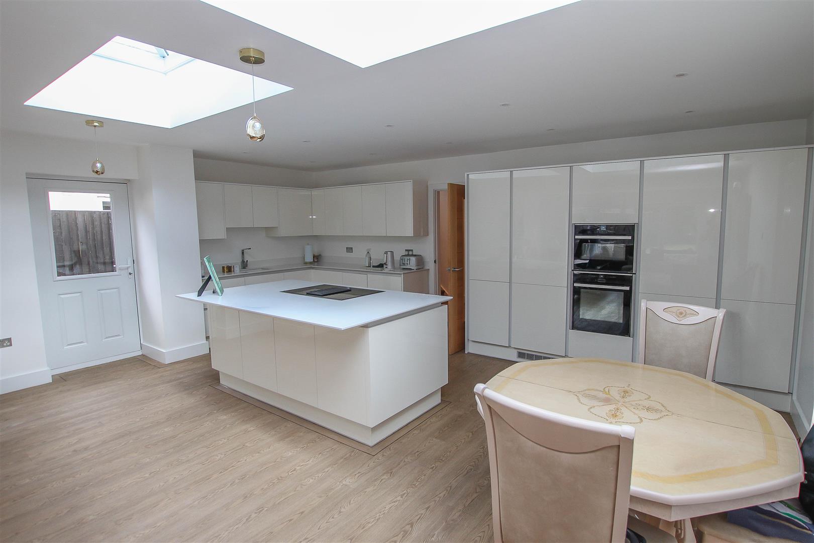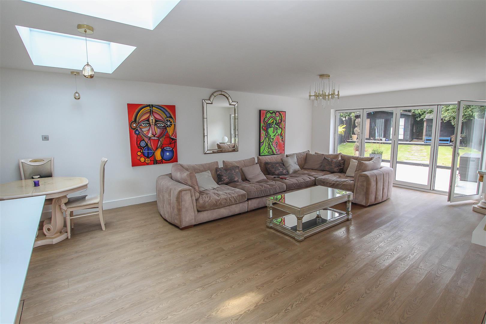 On entering the hallway, you will be drawn through to the large open plan kitchen and family room. This delightful open space is fitted with modern high gloss kitchen units with integrated appliances, including double oven, induction hob, washing machine and dishwasher. This spacious room has beautiful Amtico flooring throughout and benefits from underfloor heating. The bi-fold doors allow full access out to the garden making this a perfect entertaining space.