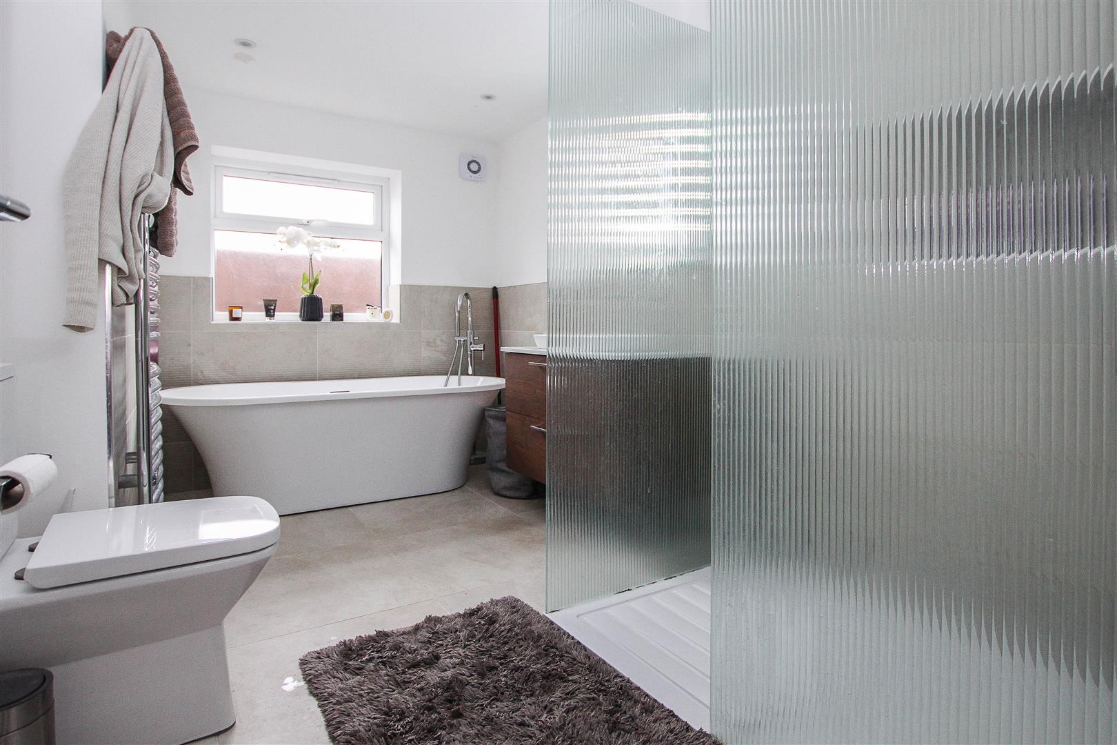 Family Bathroom - Free standing slipper bath, walk-in shower cubicle, wash hand basin and w.c.