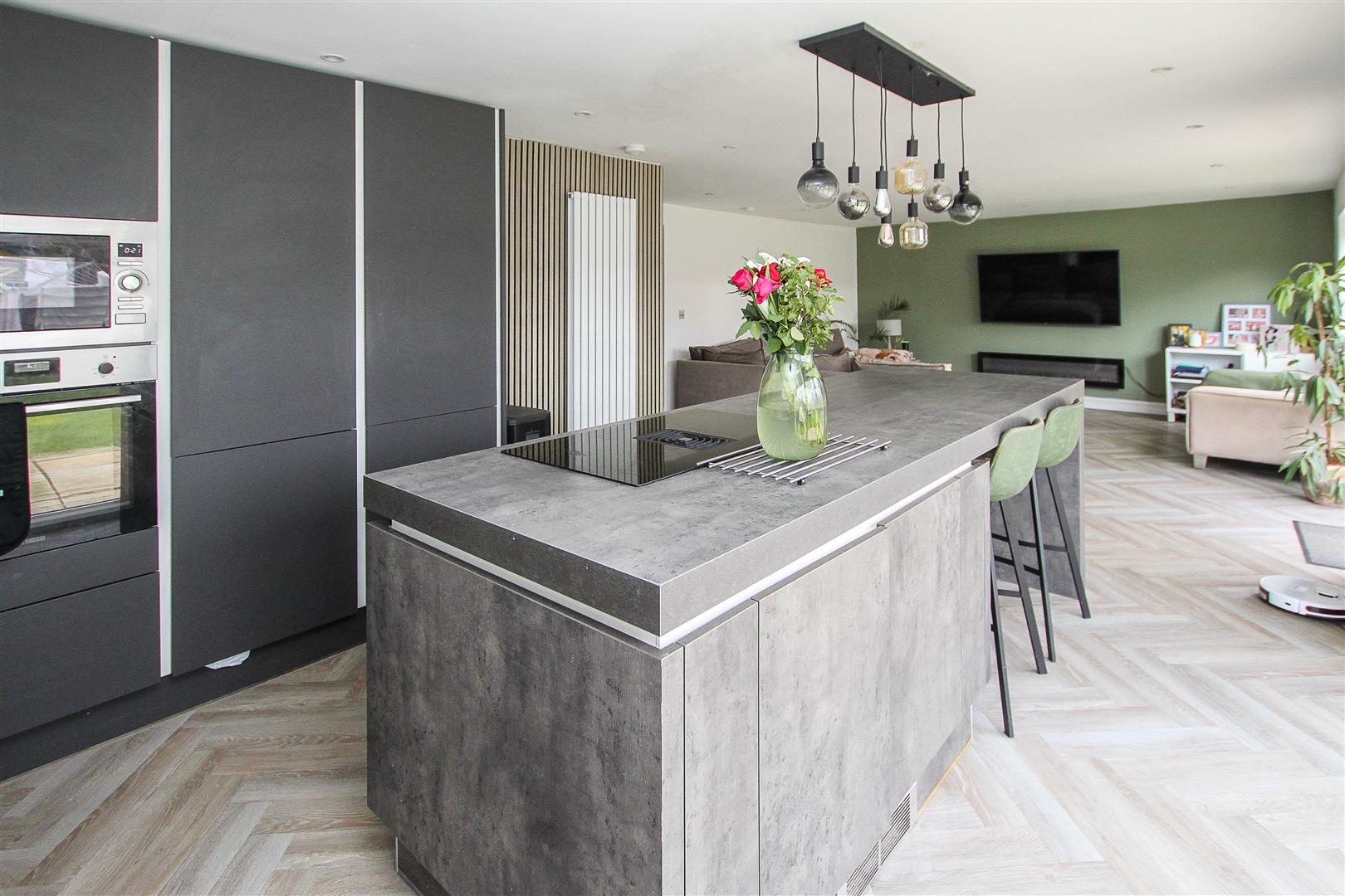 As mentioned, the property has been extended to the rear to accommodate a beautiful and spacious kitchen / family room with two sets of bi-folding doors giving access into the garden. The kitchen has been fitted in a modern range of dark grey wall and base units and includes a central island unit with breakfast bar seating for four, and additional storage. Set into the island unit is an induction hob with built-in extractor and further appliances include an integrated oven and microwave. The wooden flooring in the kitchen and family area is laid to a lovely herringbone effect.