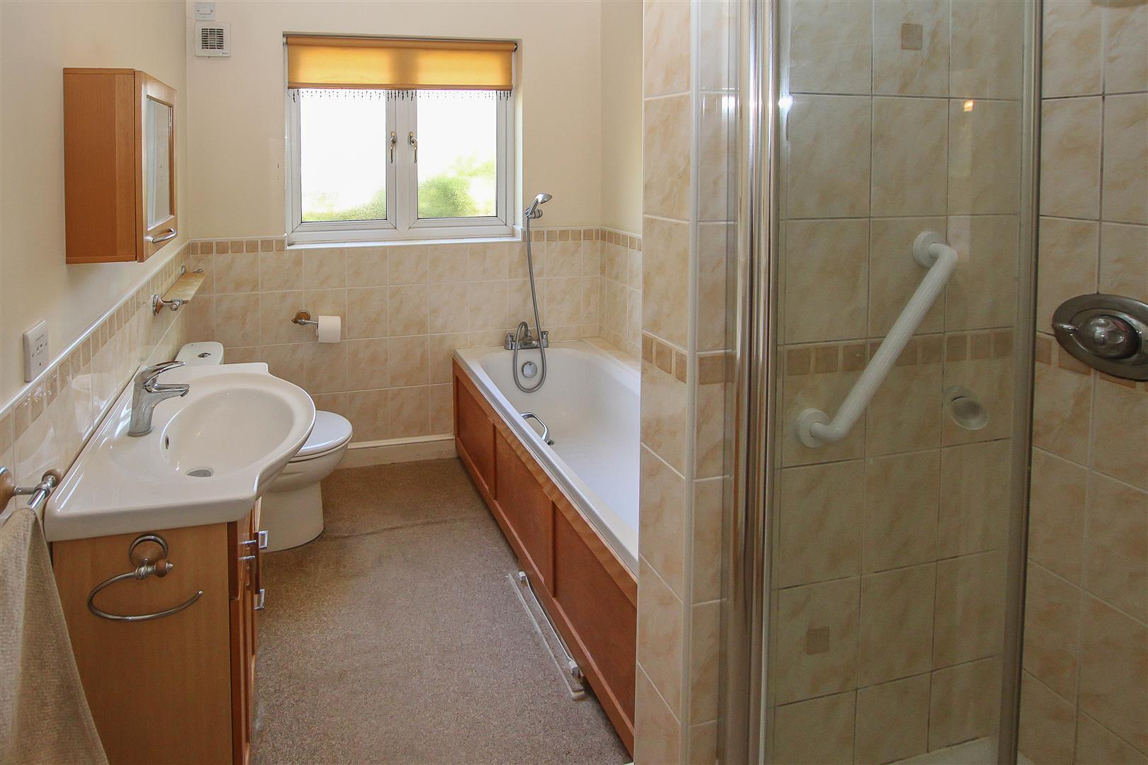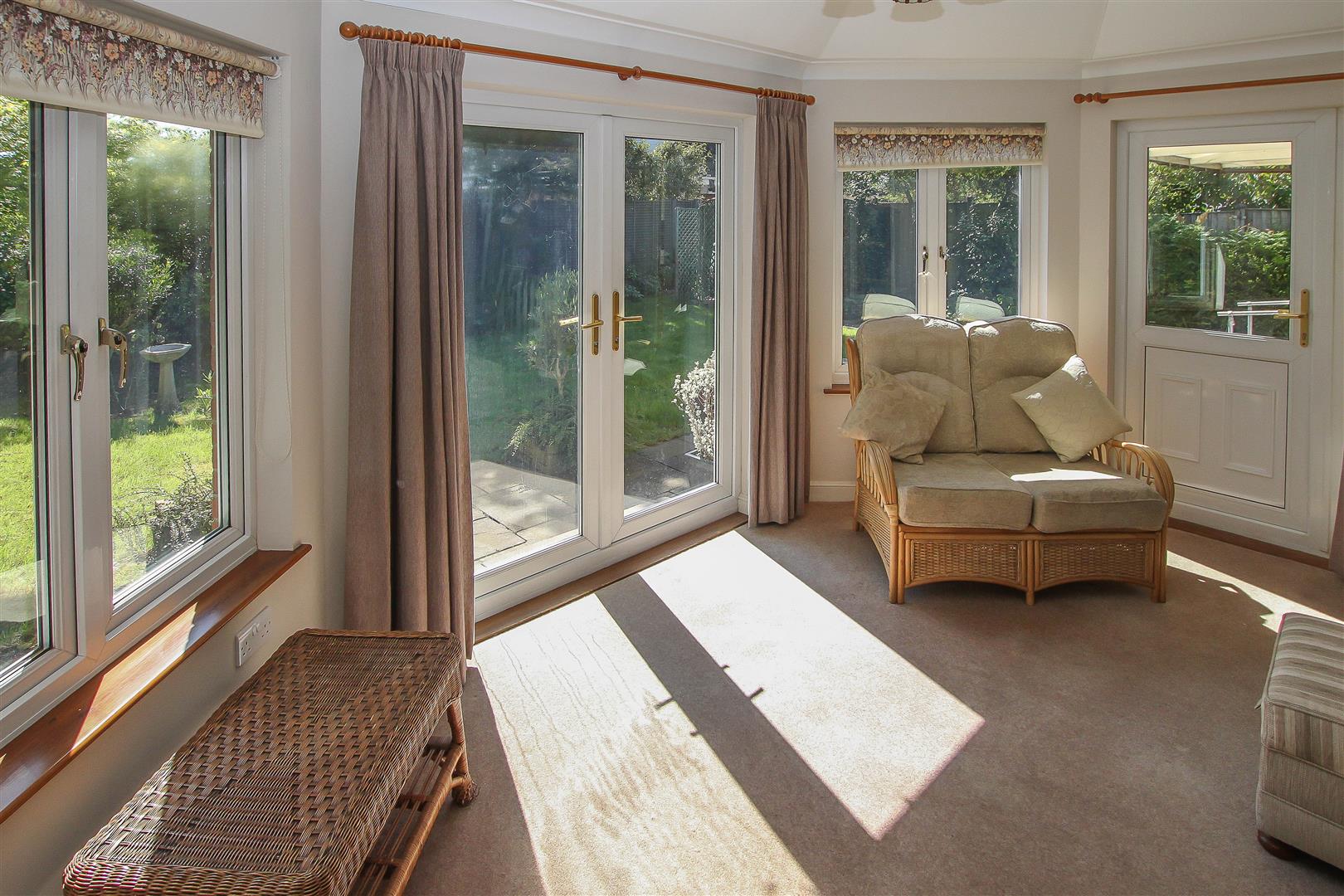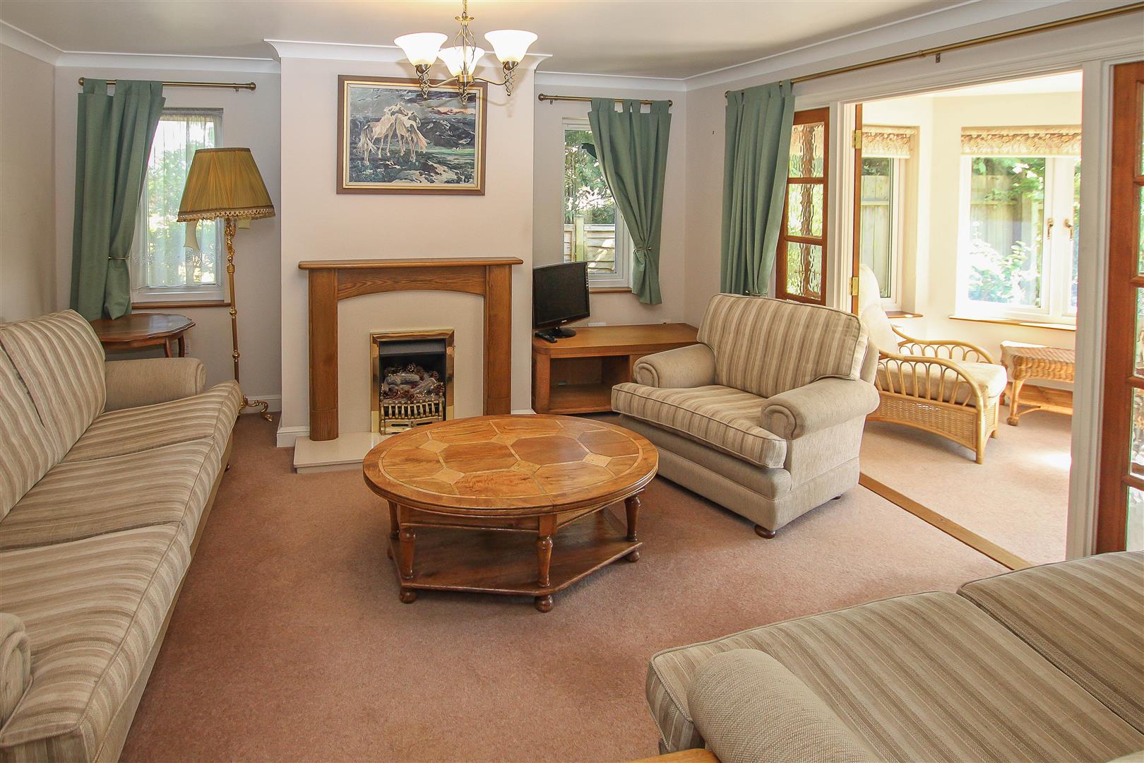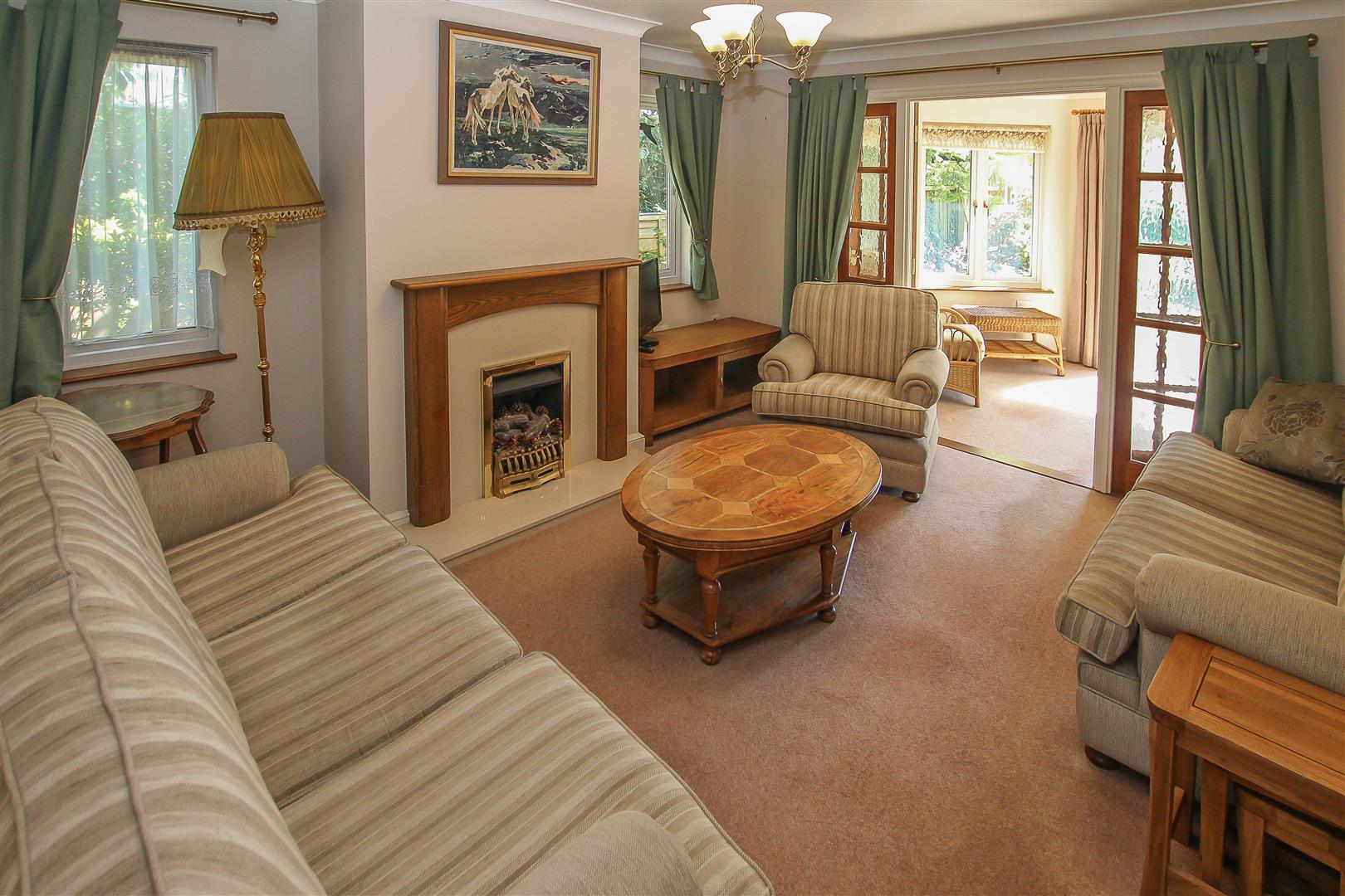 The comfortable living room has a fireplace with window either side and double doorway out to the bright and airy garden room. The tiled bathroom has both bath and separate shower and concludes the internal space of this pleasant home.