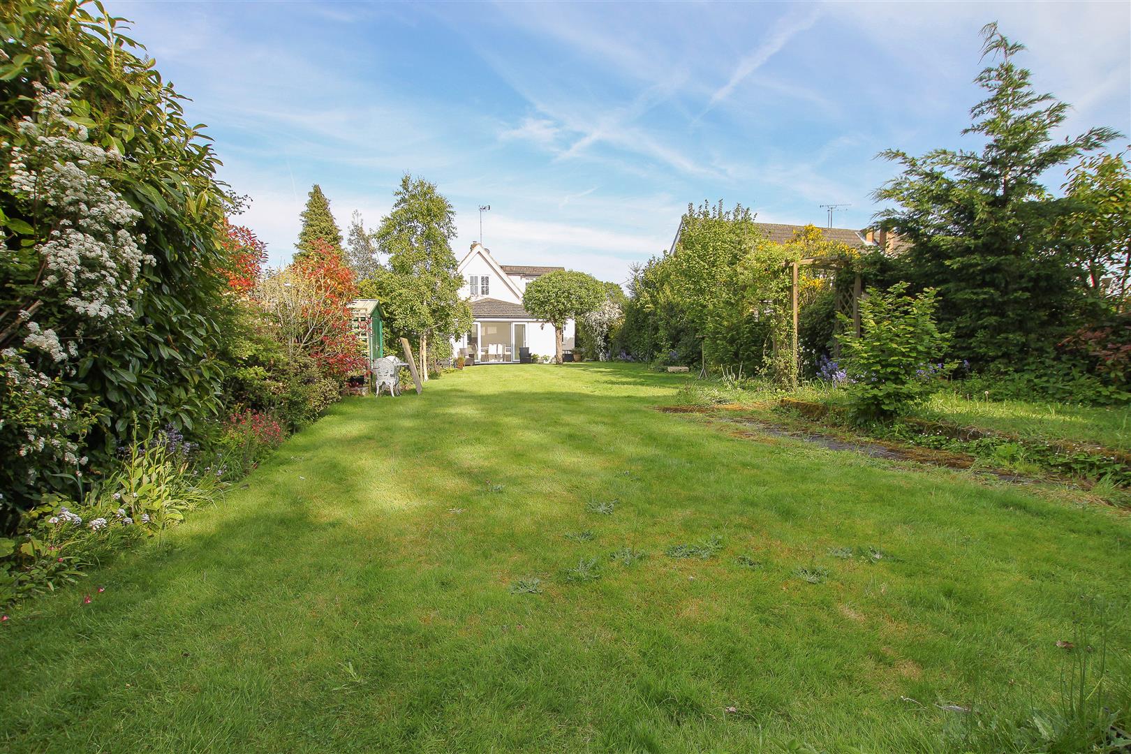 West Facing Rear Garden - approx 36.58m in length (approx 120' in length) - With metal shed. Neat lawns.