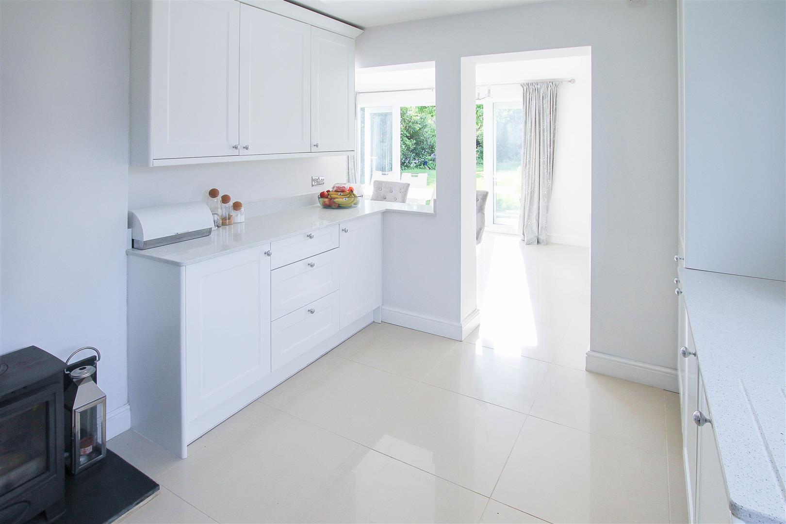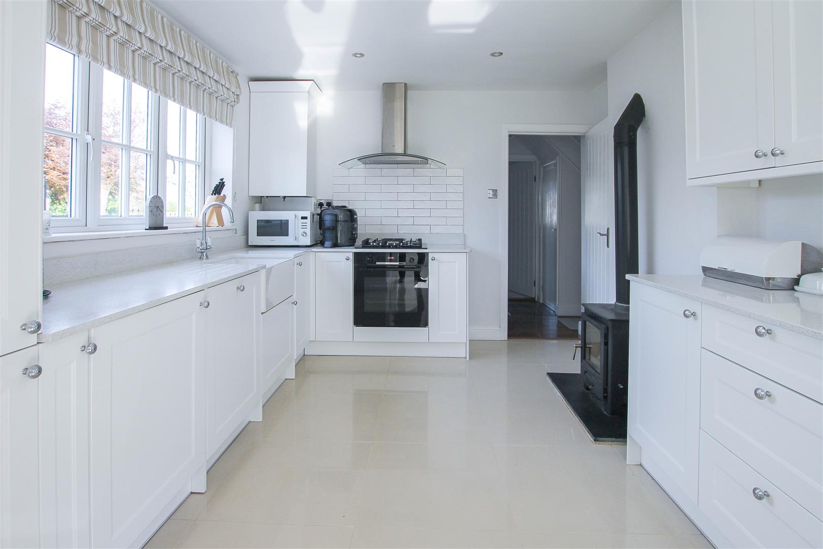 Kitchen - 3.68m x 3.30m (12'1 x 10'10) - Fitted with a range of high gloss wall and base units. Integrated oven with extractor hood above. Cupboard housing combination gas boiler supplying domestic hot water and radiators. Integrated dishwasher and washing machine. Log burning stove. Tiled floor.
