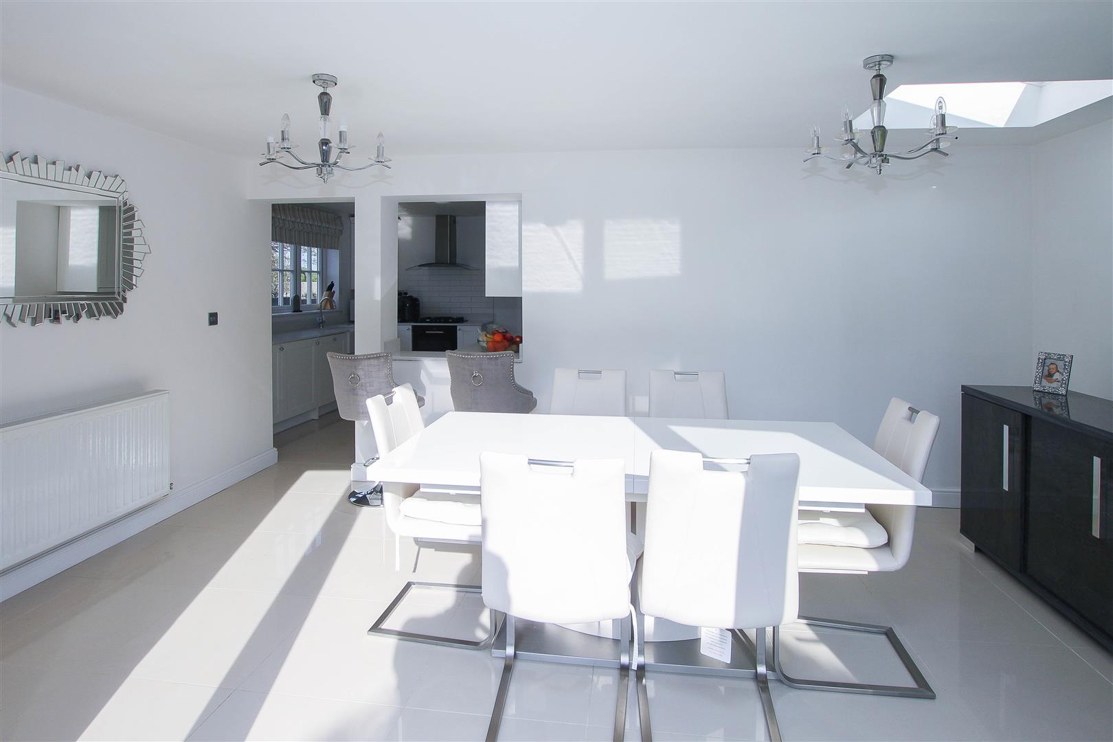 As you walk up the long gravel driveway with parking for ample cars you appreciate how well maintained the property is. Access to the house is via a modern composite front door into a large entrance porch which has further double doors leading through to the entrance hall. The hallway has stairs leading to first floor with cupboard under and immediately to your left is a ground floor large double bedroom, which has been extended to the side. As you continue along the hallway you come to the through lounge which runs across the front of the property and has a gas, log burning effect, fireplace with heavy wooden mantle over and has a double aspect. There is also a ground floor modern bathroom fitted with a contemporary white suite and a further doorway leads through to the modern high gloss fitted kitchen with integrated cooker, integrated dishwasher and washing machine and this area is open plan through to an extended dining room with French doors over looking the rear garden and a skylight window. The floor is completely tiled in a high gloss finish giving a nice modern contemporary feel.