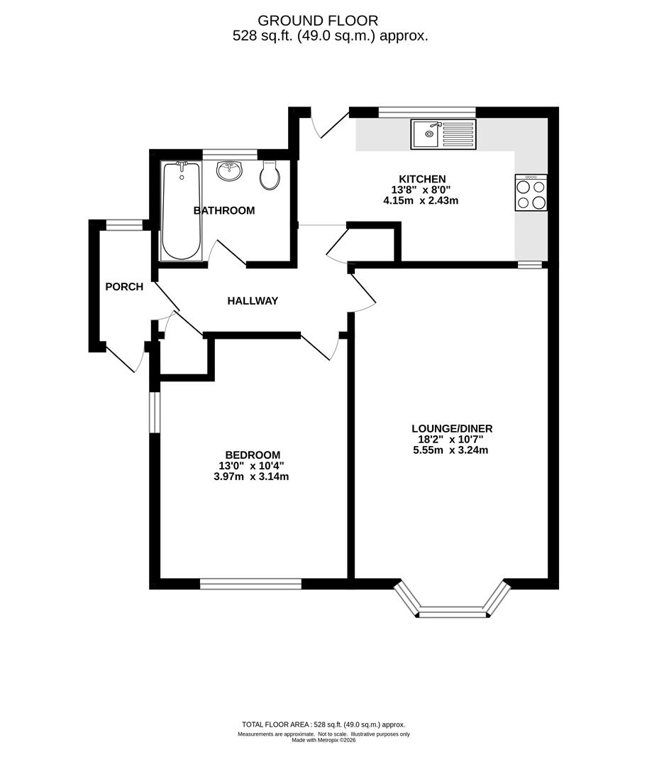A pathway to the side of the property leads to a spacious porch which has plenty of space for coat/shoe storage. A further door opens into the hallway where you have doors to all rooms and two good-sized storage cupboards. The property has a large double bedroom with windows to the front and side and there is ample space for either fitted or freestanding furniture. A spacious lounge/diner has a bay window overlooking the front and there is a feature, stained glass window to one corner of the room.