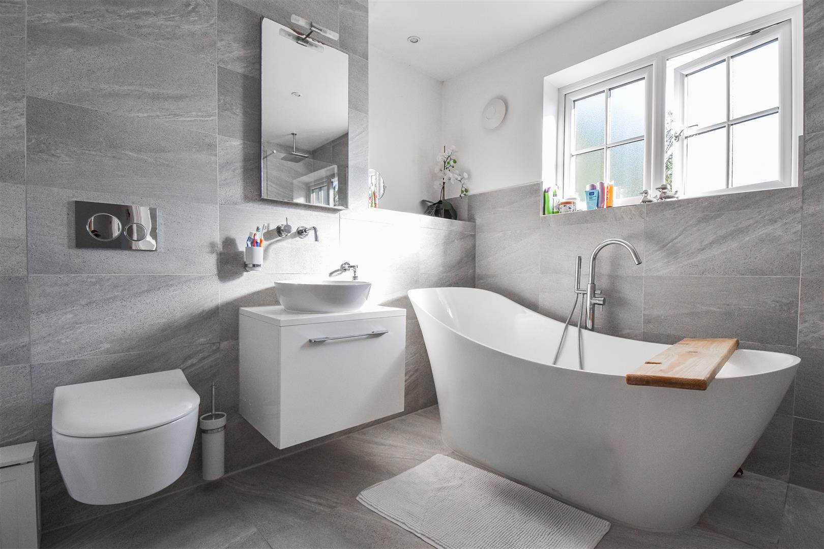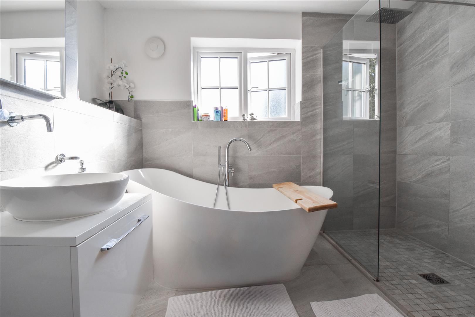 Family Bathroom - 3.84m x 2.57m (12'7 x 8'5) - Spacious bathroom with freestanding slipper bath with central up and over mixer taps, fully tiled walk-in shower, wash hand basin and w.c. with hidden cistern.