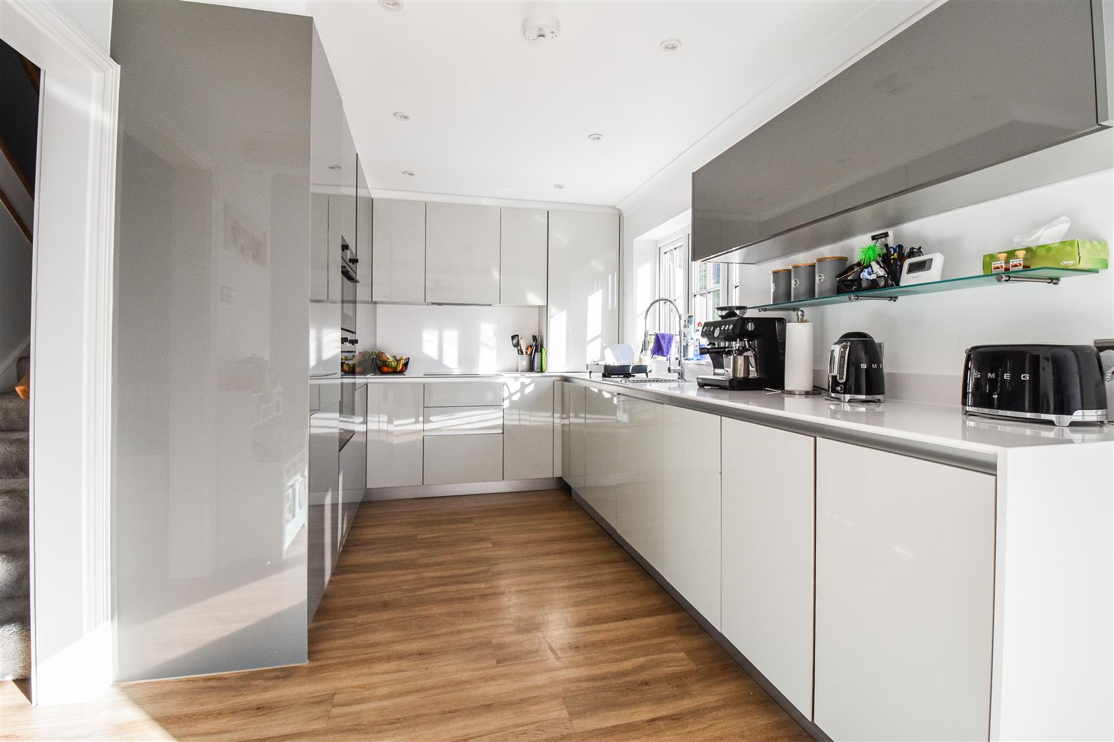 Kitchen - 3.81m x 2.72m (12'6 x 8'11) - Modern gloss wall and base units with integrated double oven, hob with extractor above and fridge freezer. Space for further appliances. Window to rear aspect. Kitchen is also accessible from the hallway.