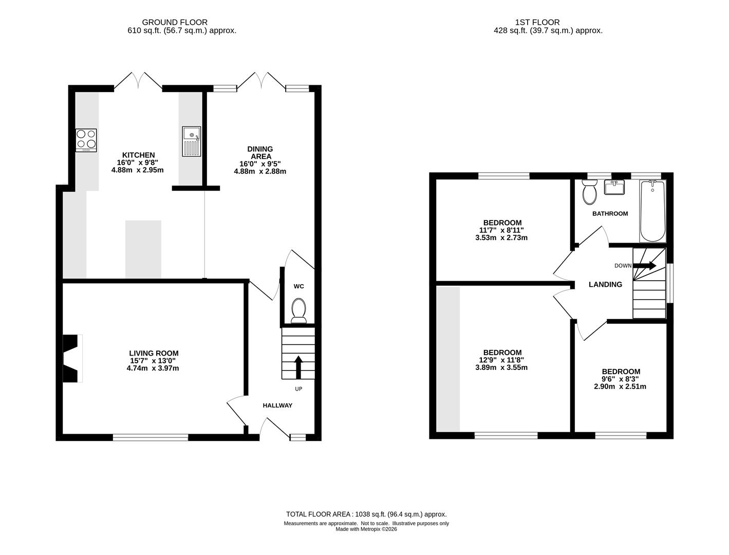 Upstairs, the first-floor landing provides access to three well-proportioned bedrooms, including a principal bedroom with built-in wardrobes. A sleek, modern family bathroom completes this level.