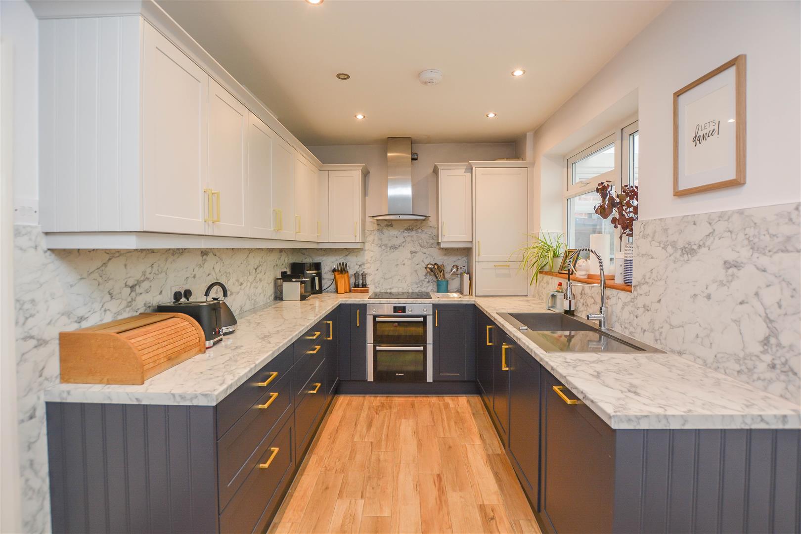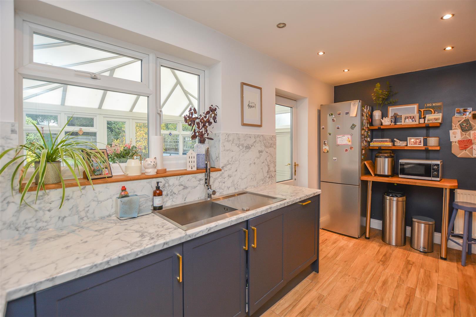 The accommodation begins with an inviting entrance hall leading into a bright and comfortable lounge, featuring a front-facing window that fills the space with natural light. Adjacent lies the stylish kitchen, fitted with a range of eye and base level units, ample worktop space, and integrated appliances. From here, a doorway opens into a spacious conservatory, offering an ideal dining or relaxation area and providing access to the rear garden through French doors.