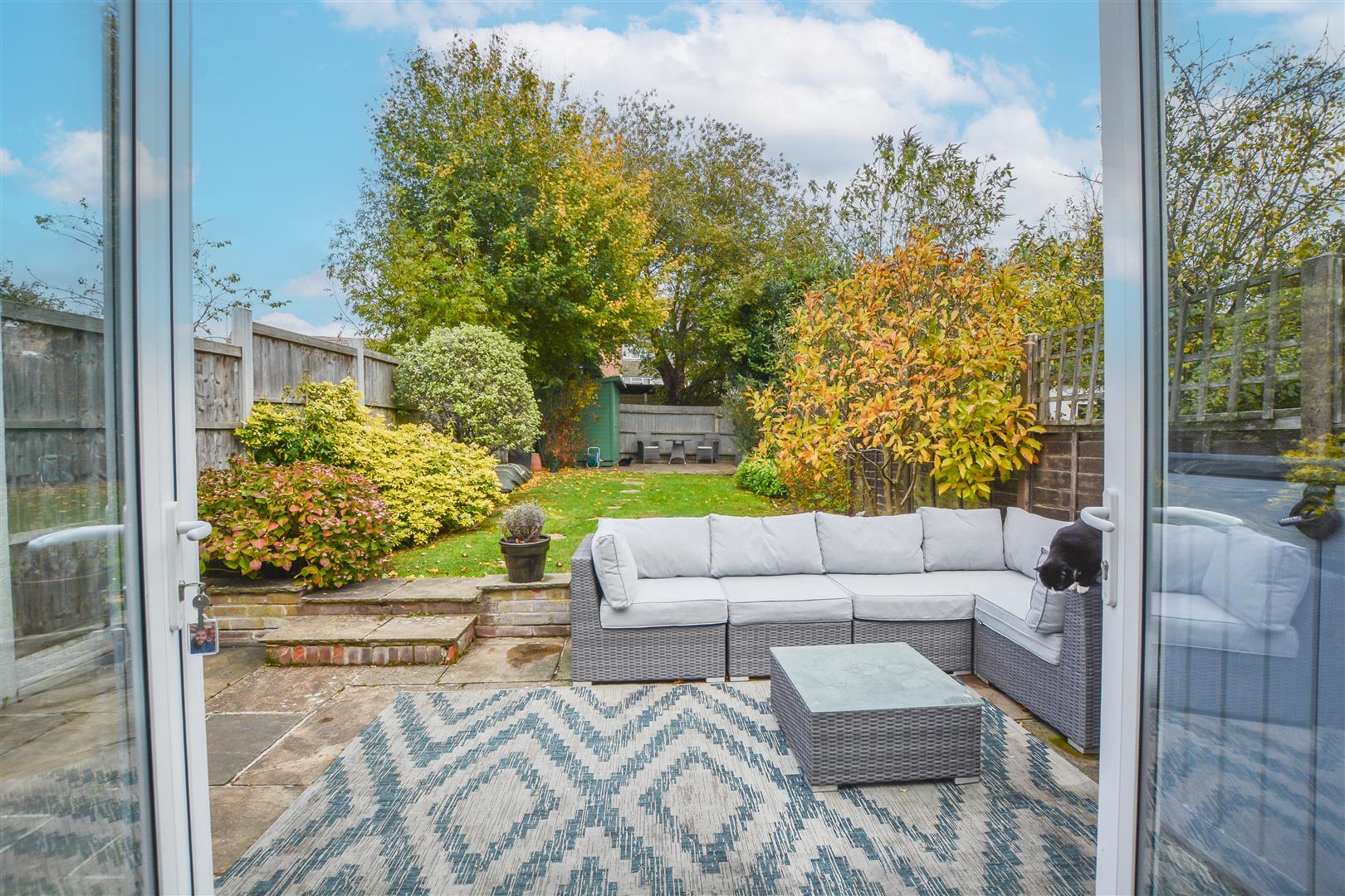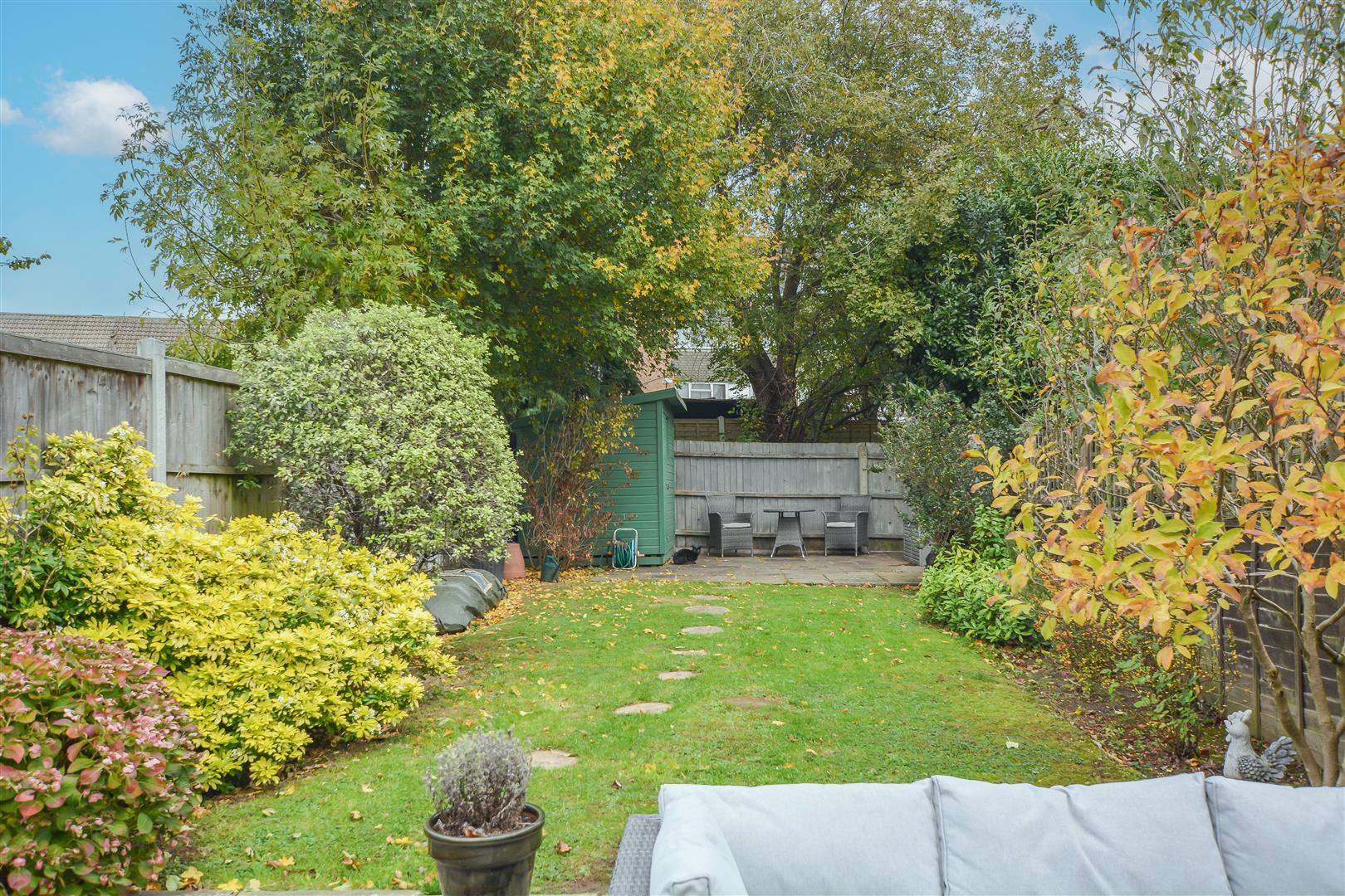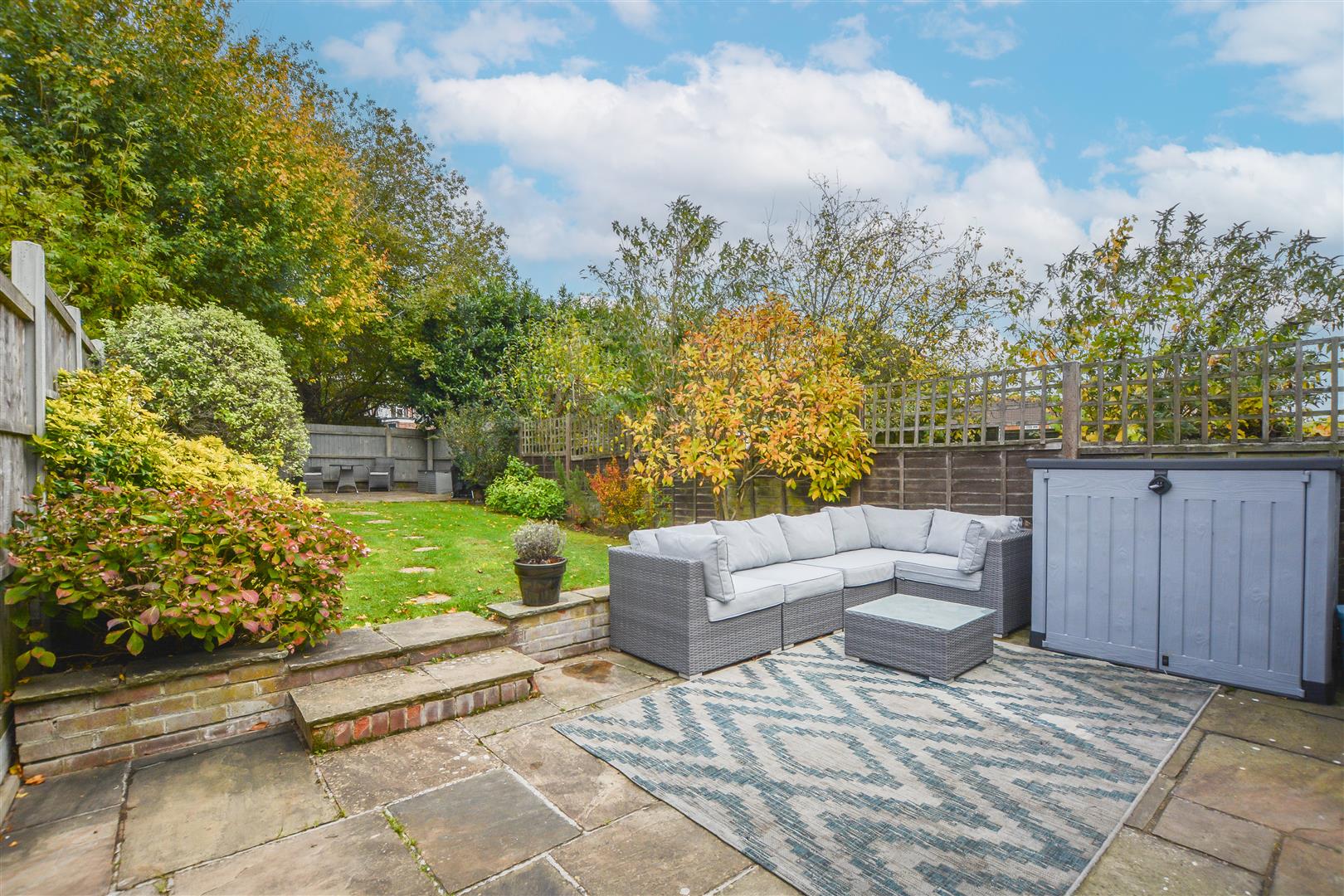 Externally, the rear garden features a paved patio area perfect for outdoor entertaining, extending to a neatly kept lawn bordered by mature shrubs, with a further paved seating area at the rear.