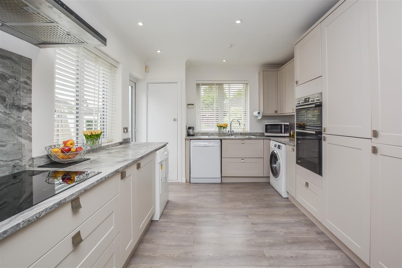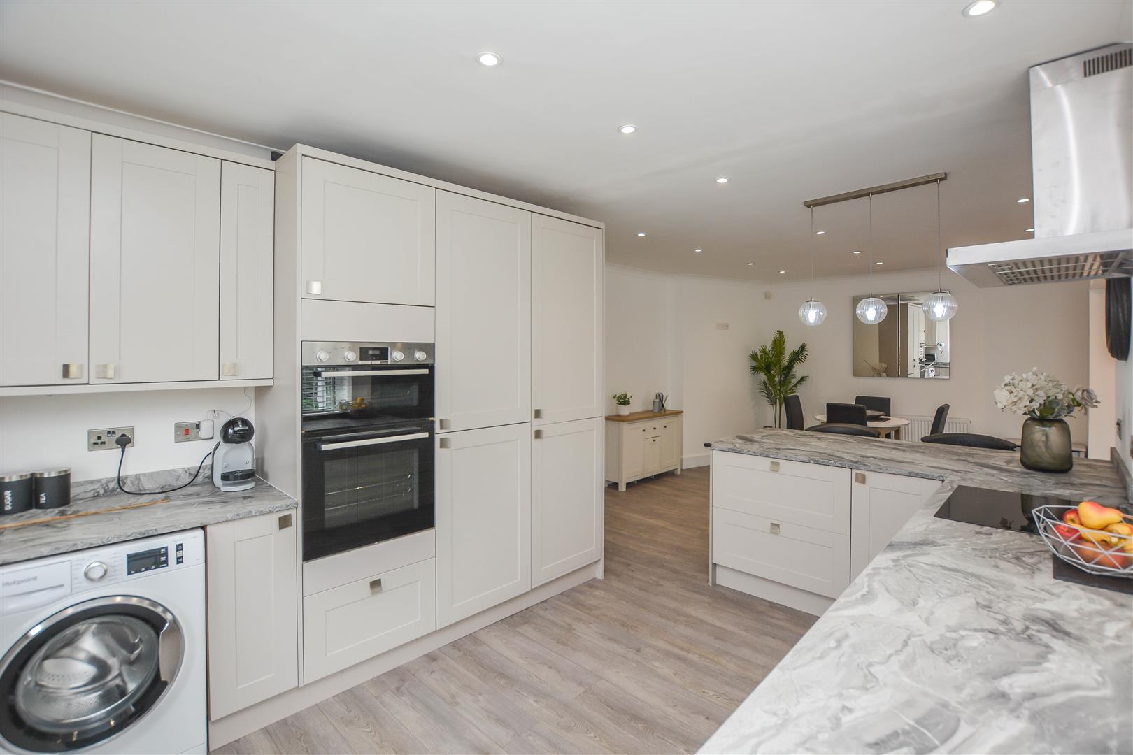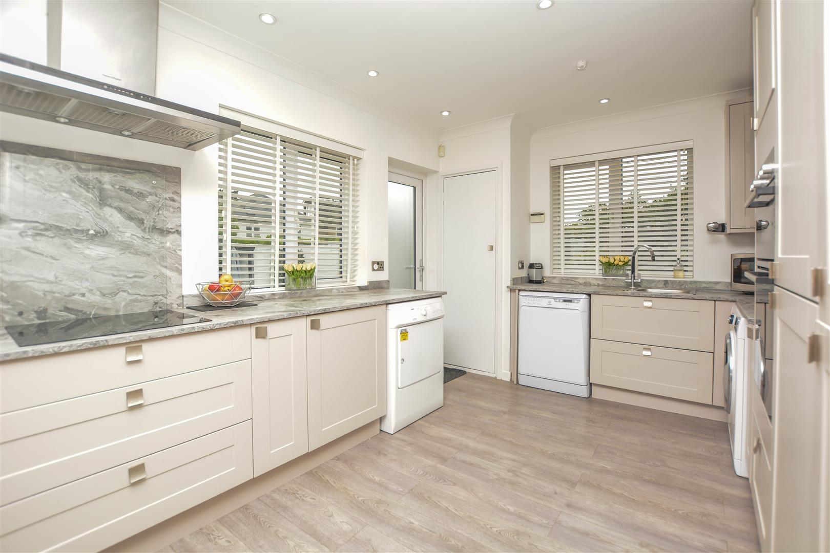 The internal layout begins with a practical porch that opens into a welcoming entrance hall, setting the tone for the spacious and thoughtfully designed interior. To the rear of the home, an impressive open-plan kitchen/dining area seamlessly flows into a bright and comfortable lounge, enhanced by large dual-aspect windows that flood the space with natural light. The well-equipped kitchen features a range of eye and base level units, generous worktop space, and direct access to the rear garden-ideal for indoor-outdoor living.