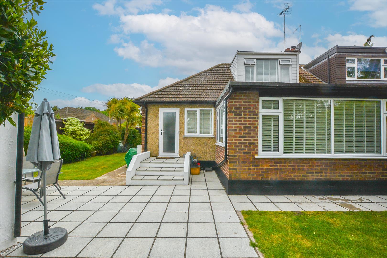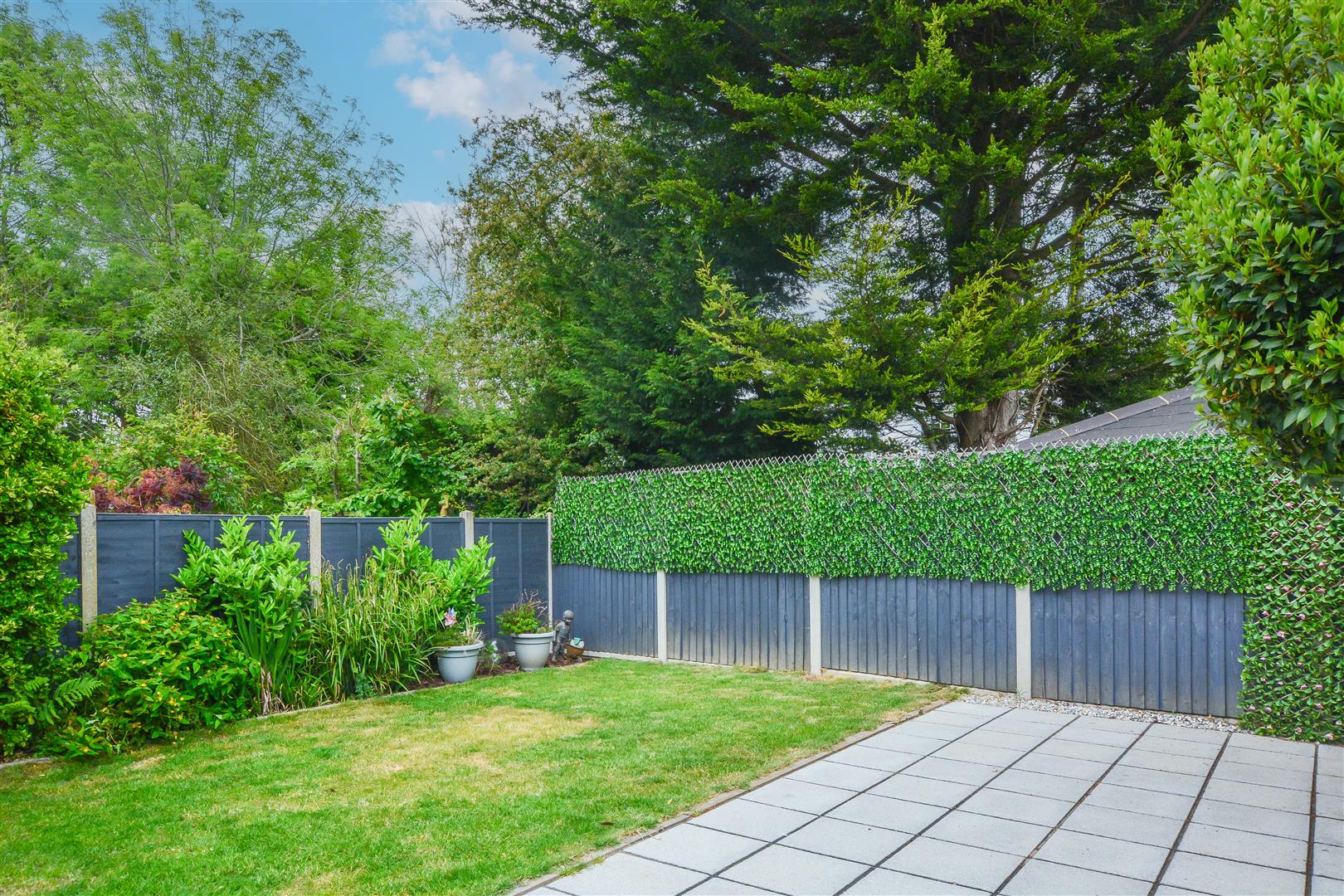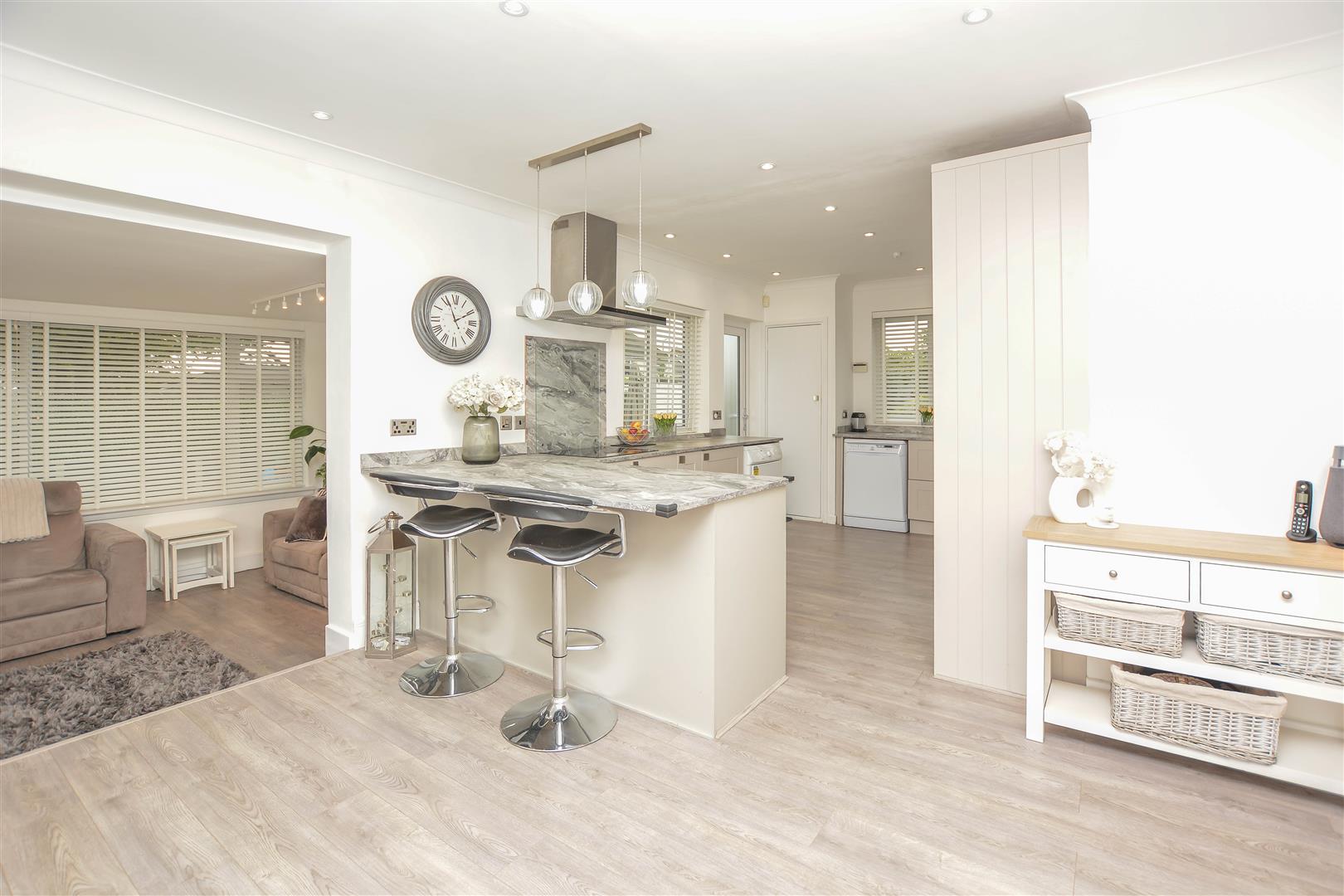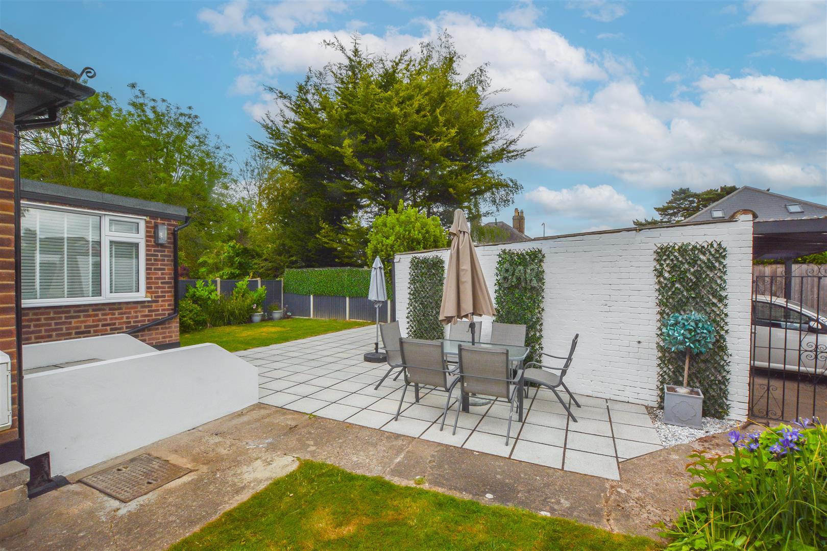 Outside, the beautifully maintained wrap around garden begins with a paved patio area, perfect for al fresco dining, leading to a neatly manicured lawn bordered by mature shrubs. A side gate provides access to a detached garage with two parking spaces. To the front, a block-paved driveway offers convenient off-street parking for up to four cars, while a small, landscaped garden enhances the property's kerb appeal and a side entrance gives access to the rear garden.