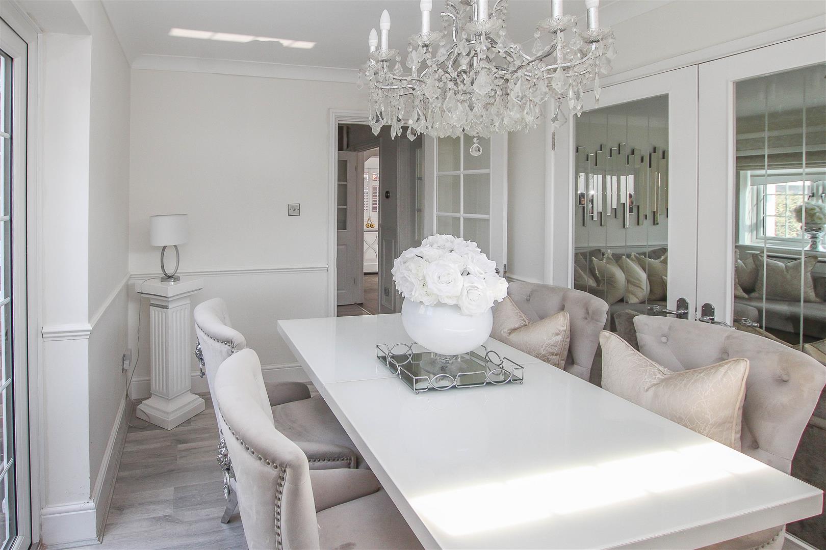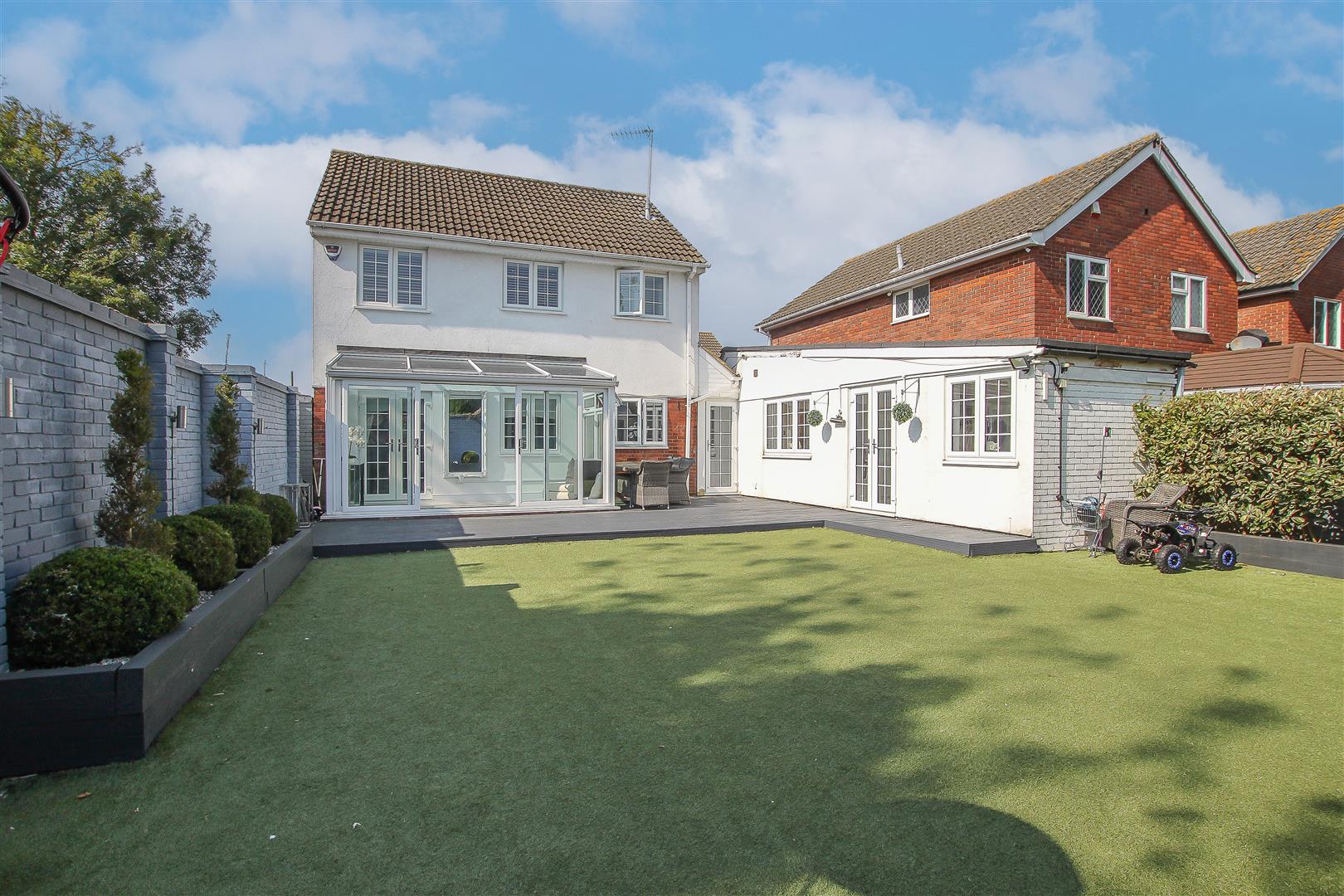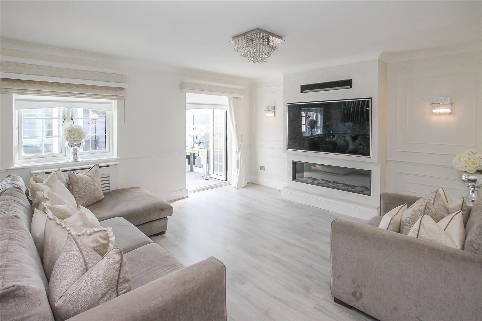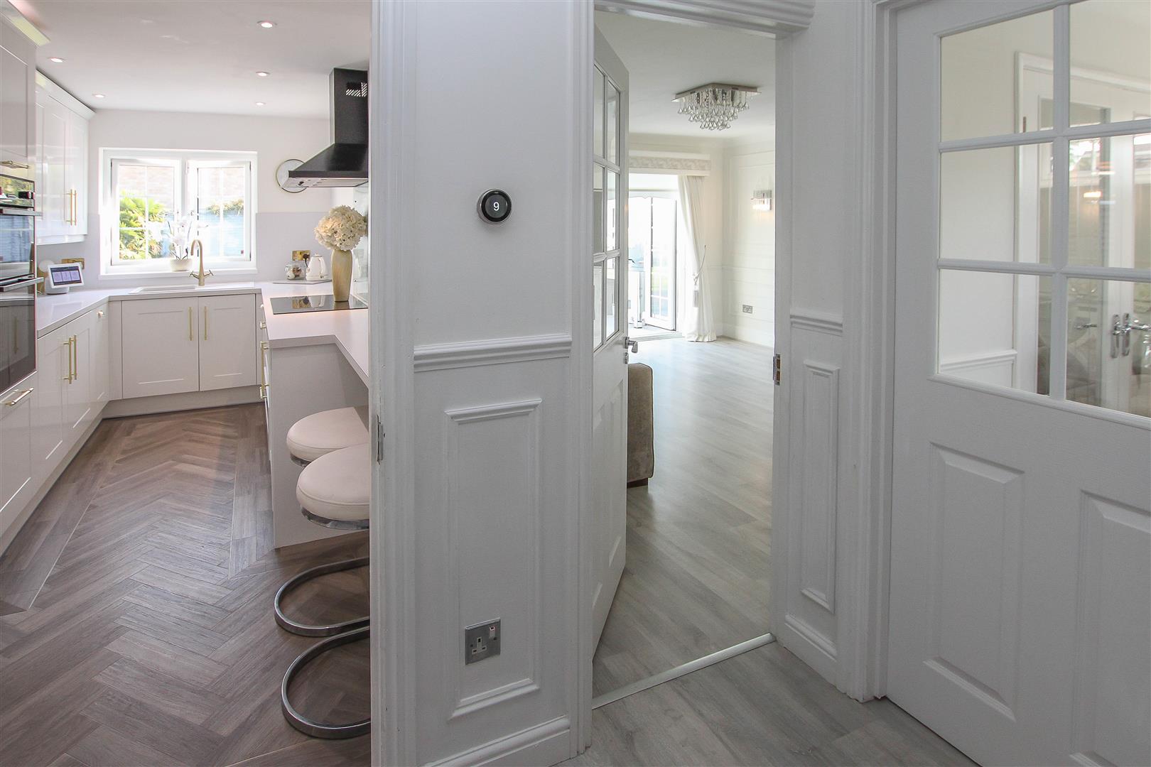 On entering '2 Lyndale' you immediately notice the stylish d?cor bringing a bright and airy feeling to this lovely family home, with half height, wooden panelled walls, modern grey, wood effect laminate flooring and carpeted stairs rising to the first-floor level. From the hallway you have access into the dining room, living room, kitchen and into a modern ground floor cloakroom with w.c. and wash hand basin with storage below. The property has two main reception rooms, a dining room which has a set of French doors to the front which open onto a private, courtyard garden. The second reception is a large and bright living room which in turn opens to the conservatory. There is a media wall in the lounge to accommodate a large, wide screen t.v and there is a contemporary electric fireplace which sits below. With windows to all aspects and a clear glass roof the conservatory gives direct access into the garden and onto a raised decking area which wraps around the rear of the property. A beautifully designed kitchen has been fitted with a good range of white 'Shaker' style wall and base units, providing excellent storage options, with contrasting work surfaces over, and there is also a breakfast bar with seating for two to one end of the kitchen. Integrated appliances include, double 'eye level' oven, four-ring induction hob with extractor above and a slimline dishwasher. Accessed via an internal lobby which has direct access through to the rear and front gardens, you will find additional space for appliances in a good-sized utility room where there is space and plumbing for a washing machine, tumble dryer and large double fronted fridge/freezer, plus work surface and wall mounted units. From the utility there is access into a large playroom which could be utilised as a ground floor (fifth) bedroom. This room has French doors which give access into the rear garden. This section of the house has excellent potential for an annex type set up with own access and could suit an older child, or staying relatives/guests. Herringbone effect Amtico flooring is laid in the kitchen, inner lobby and the utility room.