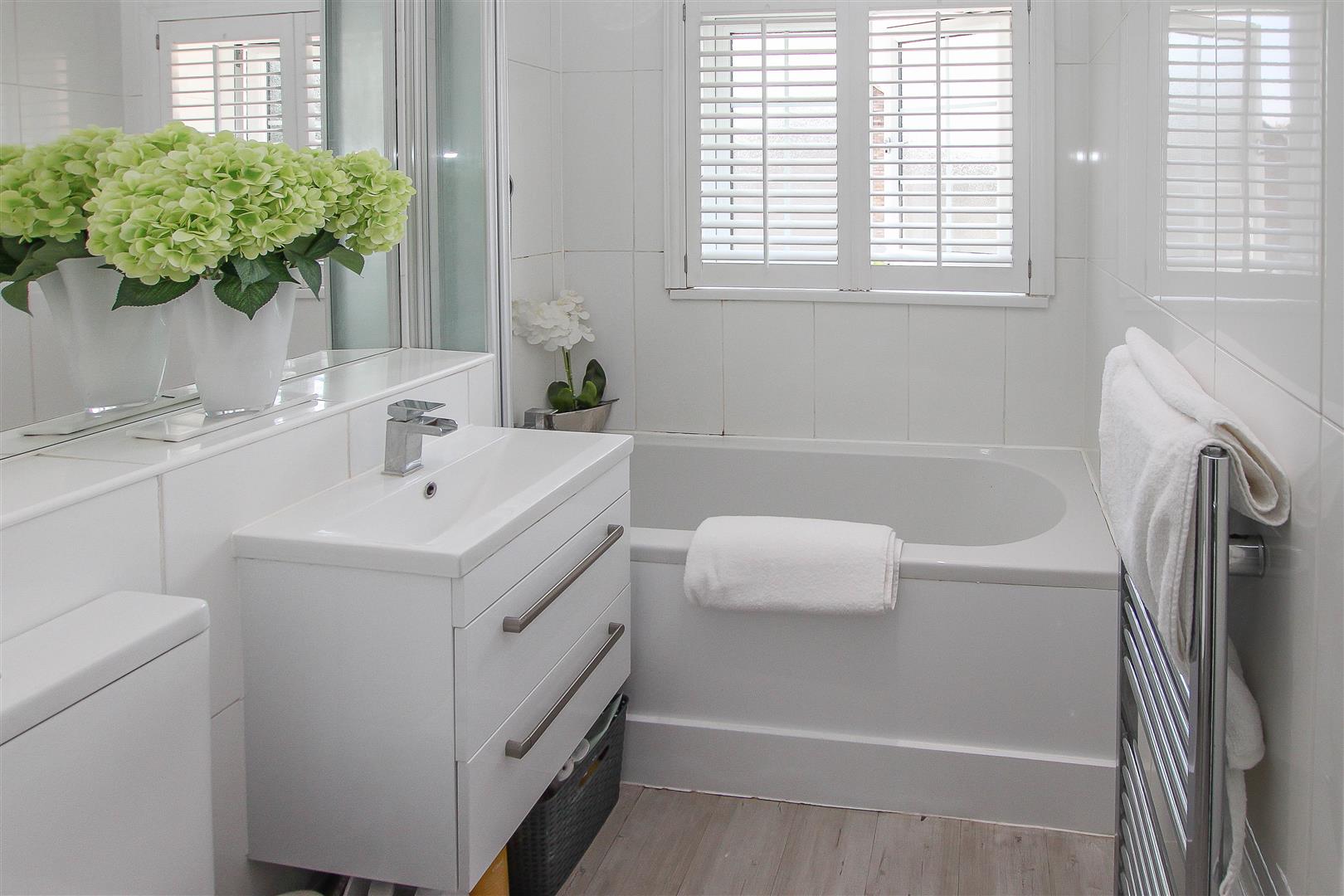 Family Bathroom - Modern white bathroom suite - panelled bath with shower over, wash hand basin set into vanity unit and close coupled w.c.