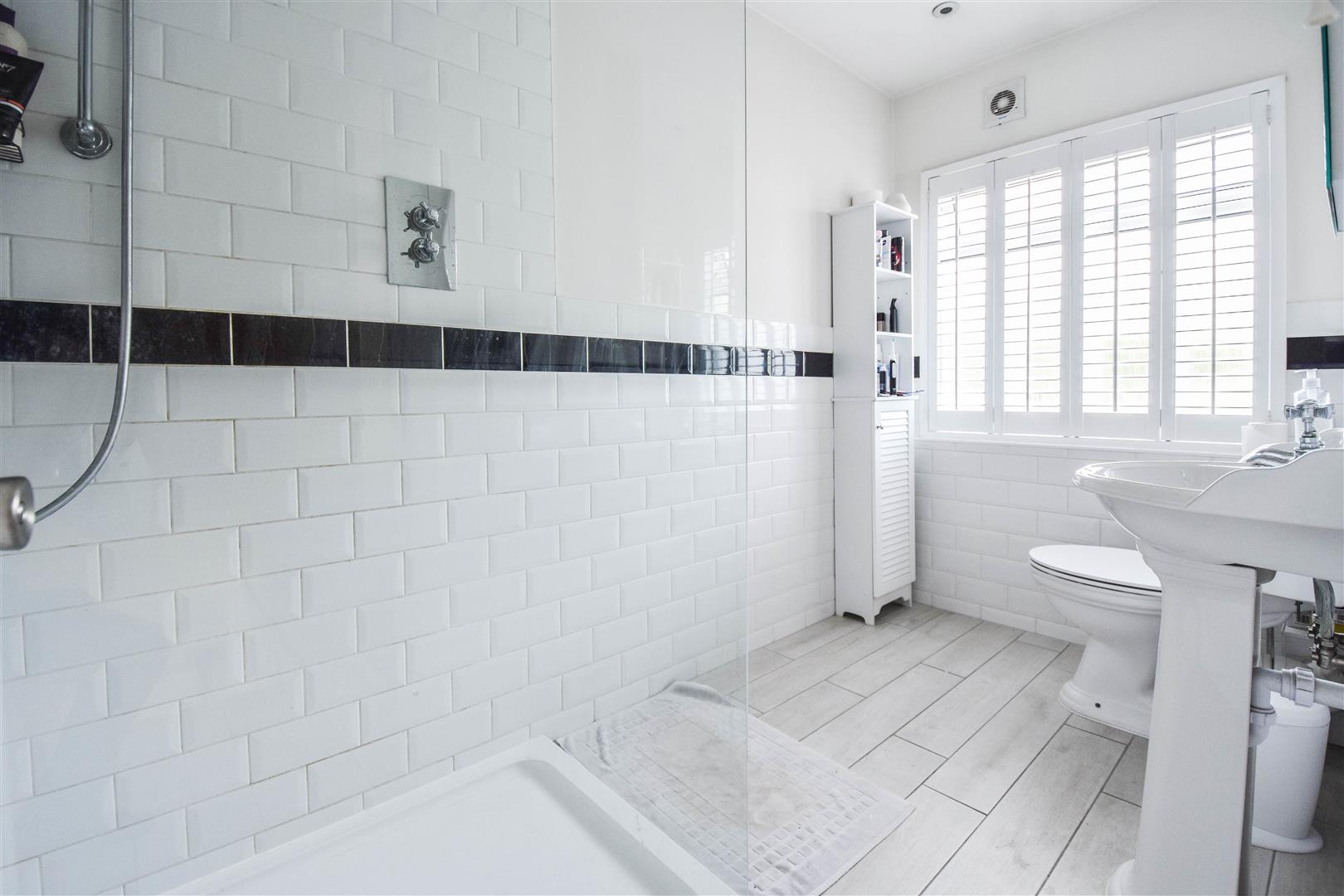 Shower Room - 2.97m x 1.37m (9'9 x 4'6) - Fitted in a three piece white suite, comprising : close couple w.c., pedestal wash hand basin, and double shower tray. Extensively tiled walls. Shuttered double-glazed windows to rear. Extractor fan. Tiled flooring.
