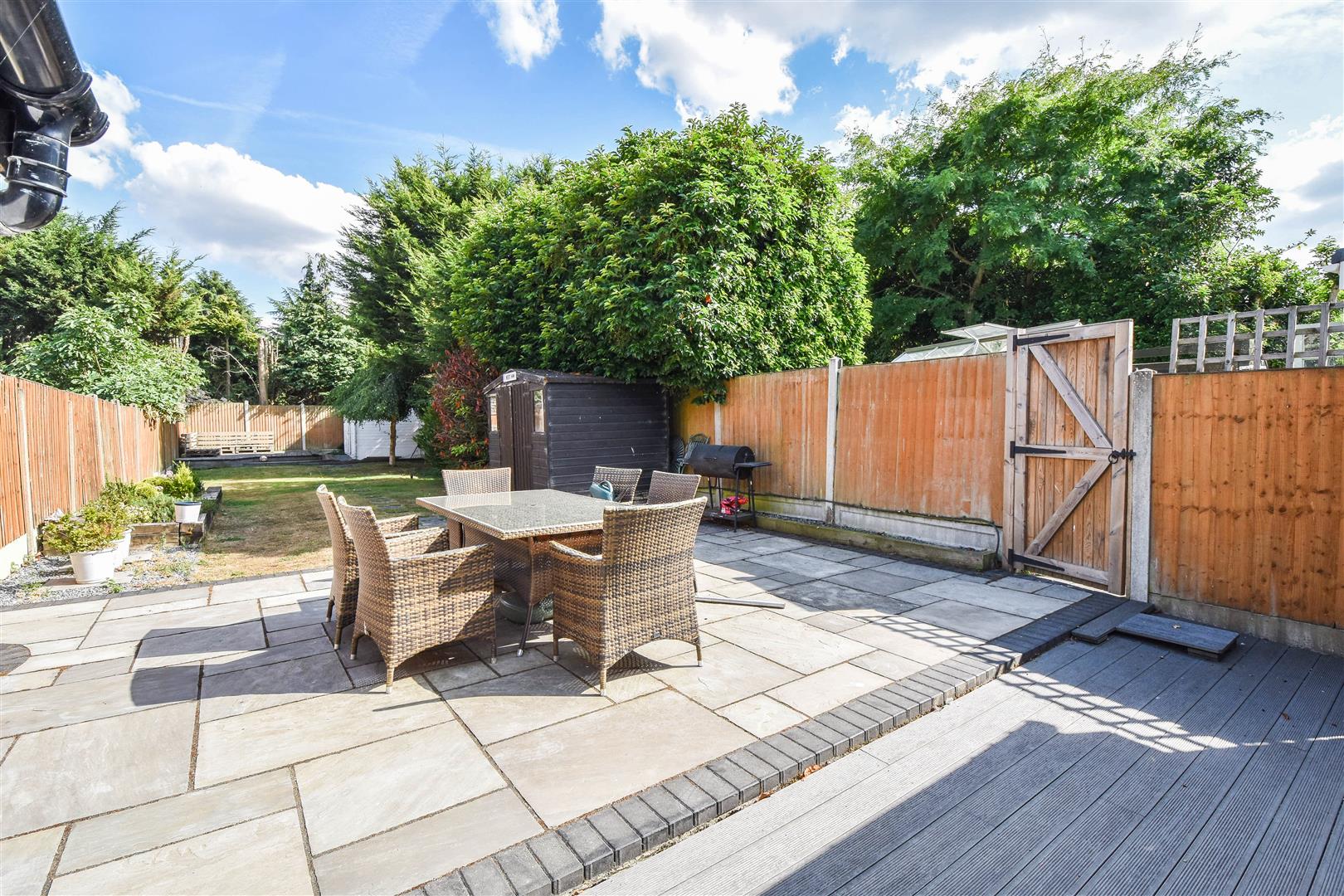 Rear Garden - 30.48m in length (approx) (100' in length (approx) - Commencing with composite decking area, leading into an Indian Sandstone patio with neat lawns beyond.