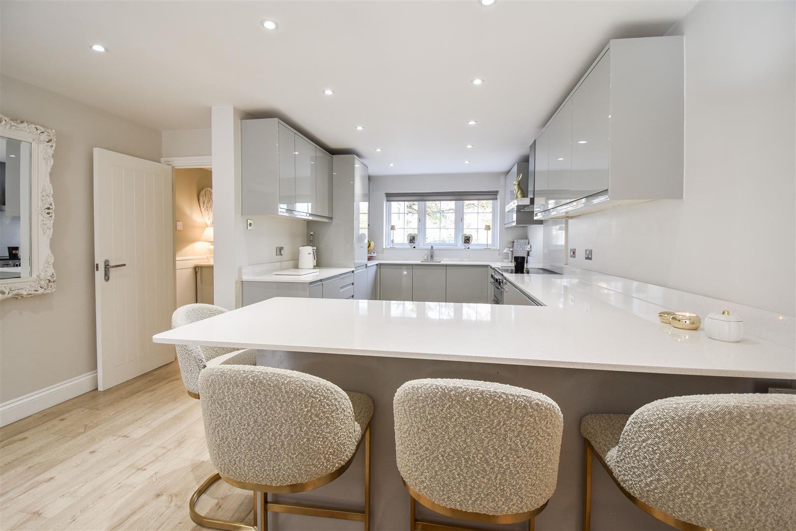 Open Plan Kitchen / Lounge / Diner - 9.68m x 4.98m (31'9 x 16'4) - Window to front aspect. Kitchen area is fitted in a lovely range of grey gloss wall and base units with Corian work surface over. Peninsular breakfast bar with seating. Space for a Range style cooker with extractor above. Water softener. Open plan to the garden room and doors into the sitting room / gym and utility room. French doors open onto the garden.