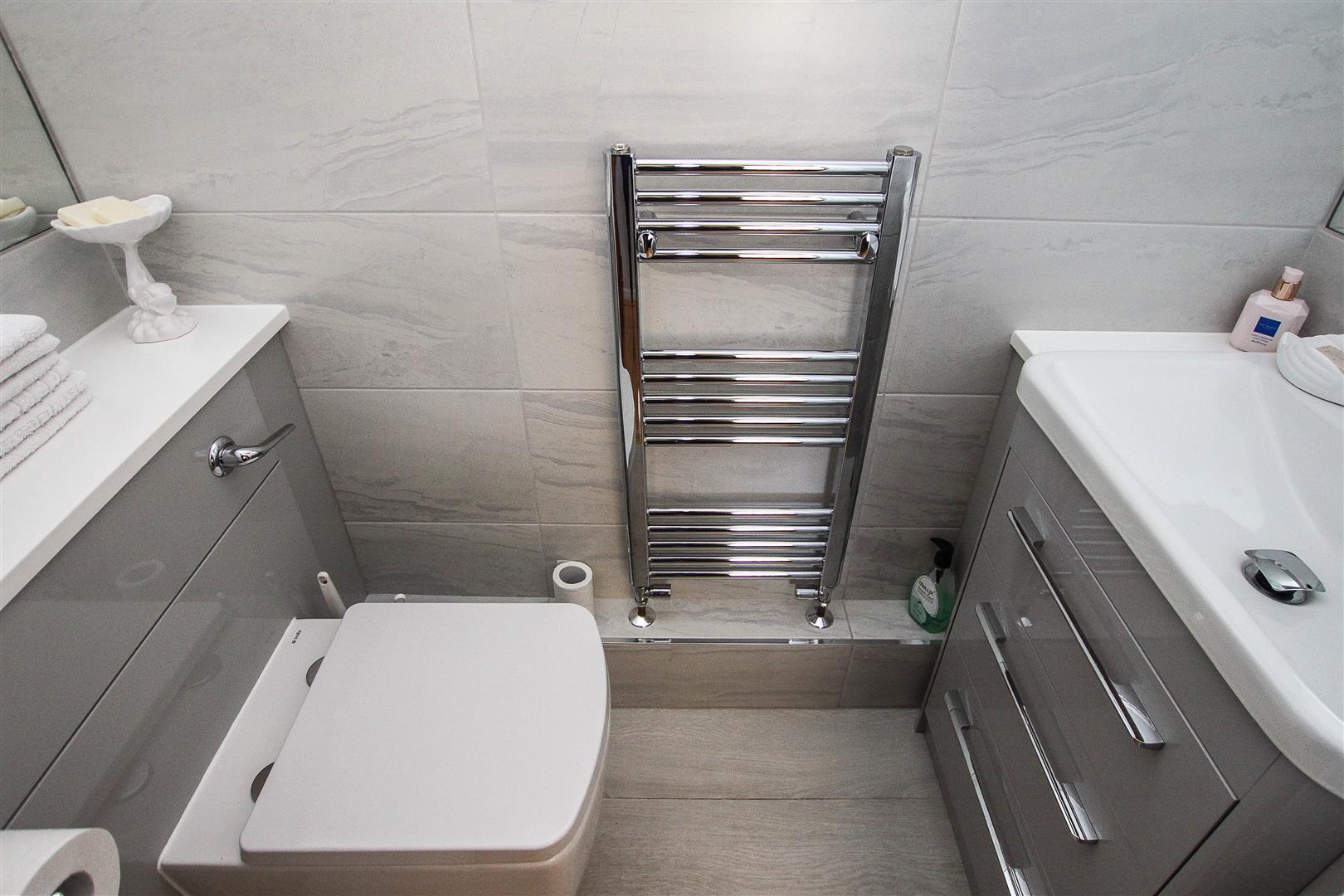 Ground Floor Cloakroom - Modern suite, comprising wash hand basin set into vanity unit and close coupled w.c. Heated towel rail. Window to side.