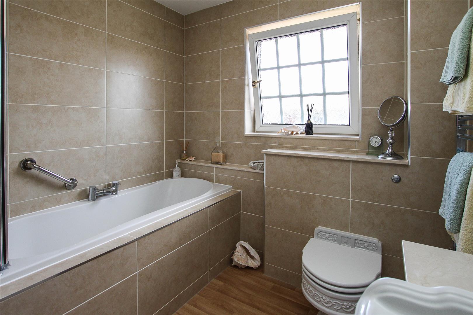 Rising to the first-floor landing there are doors to all rooms and a handy airing/storage cupboard. Bedrooms one and two have fitted wardrobes and the third bedroom has a built-in double wardrobe with fixed cupboards above running the length of the wall. The family bathroom with fully tiled walls, is fitted in a white suite comprising of a tile panelled bath with shower over, pedestal wash hand basin and close coupled w.c.