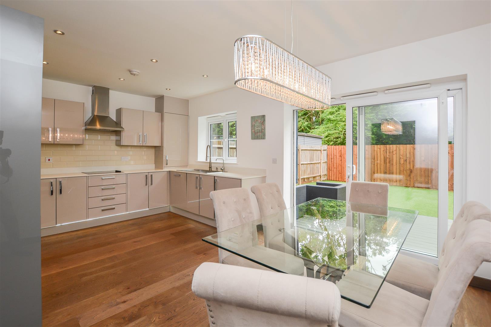 The internal layout opens with a welcoming entrance hall that flows seamlessly into a bright and inviting lounge positioned at the front of the home. To the rear, a stunningly designed kitchen showcases sleek high-gloss wall and base units, quartz worktops, and a range of integrated appliances. Double sliding doors flood the space with natural light and provide direct access to the rear garden. Practical features include under-stair storage and a conveniently located WC, completing the ground floor.