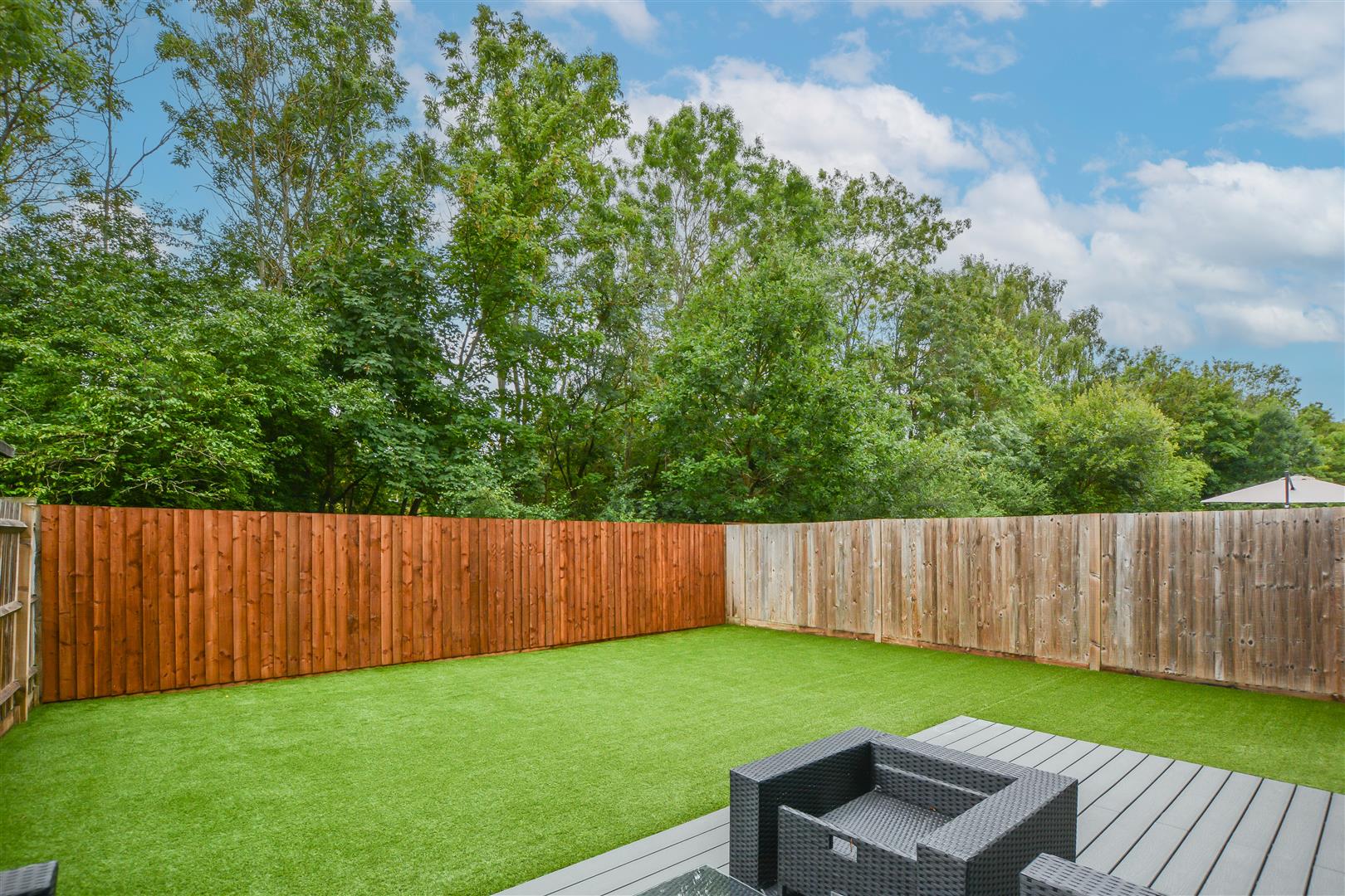 Outside, the south-facing rear garden begins with a decked seating area, ideal for outdoor entertaining, leading to a low-maintenance artificial lawn. The property also benefits from a double-length garage, accessible both from the garden and via an up-and-over door at the front.