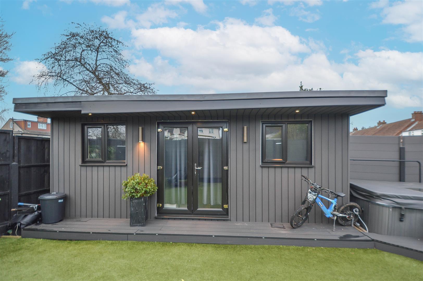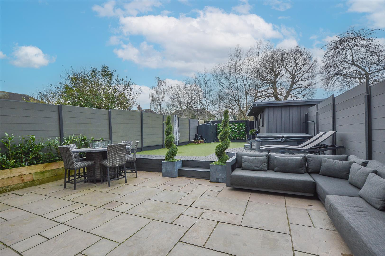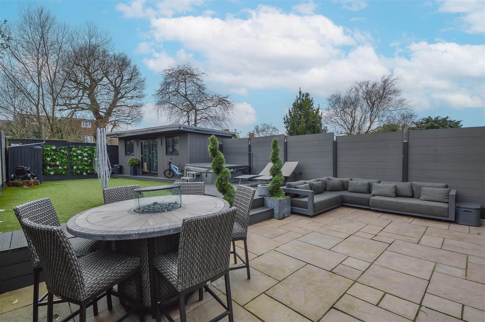 Externally, the rear garden is designed for both relaxation and entertaining. A spacious paved seating area steps up to an elegant, decked lounge space, complemented by a low-maintenance artificial lawn. At the garden's base, a self-contained annexe with shower room offers versatile accommodation, ideal for guests or a home office. To the front, a generously sized block-paved driveway provides ample off-street parking, completing this exceptional family home.